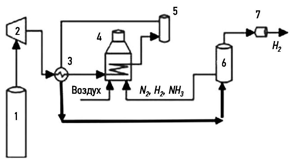 Рис. 3. Технологическая схема получения водорода из аммиака [14]. 1 — ёмкость для хранения аммиака; 2 — насос; 3 — теплообменник; 4 — огневой подогреватель; 5 — реактор разложения аммиака; 6 — мембранный сепаратор; 7 — блок очистки водорода.