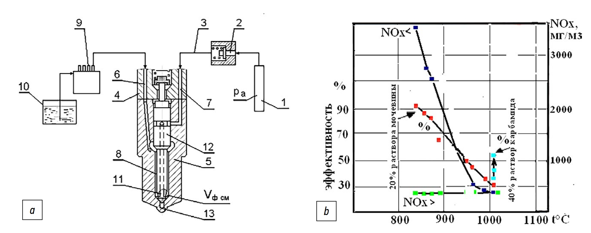 Рис. 4. Схема подачи аммиака в камеру сгорания дизельного ДВС (a) и температурная характеристика нейтрализации оксидов азота в дымовых газах (b). 1 — аккумулятор аммиака, 2 — запорный клапан, 3 — подающая магистраль, 4 — форсунка, 5 — распылитель, 6 — канал подачи дизтоплива, 7 — канал подачи аммиака, 8 — игла распылителя, 9 — ТНВД, 10 — топливный бак.