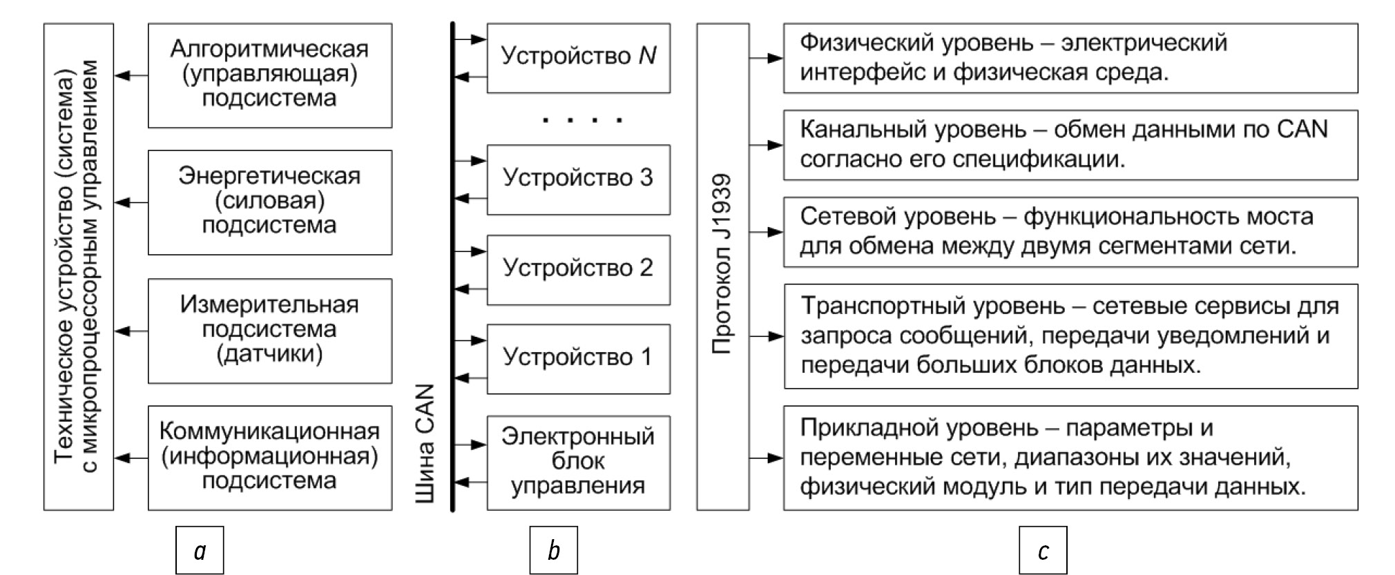 Сетевые протоколы на базе CAN имеют несколько уровней, подчинённых стандартам и реализуемых с помощью программных и аппаратных средств. Например, состав уровней протокола J1939, распространённого в автомобильной технике, показан на рис. 1,c. В сети Internet имеется большое количество спецификаций этого протокола, а также сведений о его применении в автомобильной технике.