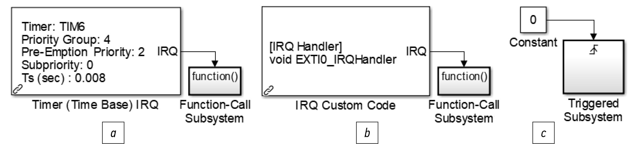 Обработка прерывания при переполнении таймера, реализованная с помощью модельной схемы, которая показана на рис. 2,a, осуществляется с назначенным приоритетом через равные интервалы времени стабильной продолжительности. Модельная схема, показанная на рис. 2,b, предназначена для приоритетной обработки внешнего прерывания, вызываемого аппаратной установкой системного флага при перепаде логического сигнала на заданном входе микроконтроллера по мере его возникновения, а значит, без интервала повторения. Эта же модельная схема может быть использована для обработки приоритетного прерывания при программной установке системного флага, если внешнее прерывание отключено. Подсистема Triggered Subsystem, показанная на рис. 2,c, выполняется с минимальным приоритетом при изменении программного флага Constant, одноимённого с модельным элементом из библиотеки Matlab/Simulink, что характерно для фонового цикла [7]. Изменение этого флага детектируется программно. При большой частоте повторения его проверки требуется значительный вычислительный ресурс микроконтроллера. В разделе Ports & Subsystems библиотеки Matlab/Simulink имеются различные подсистемы, управляемые подобно подсистеме Triggered Subsystem в зависимости от программных флагов, которые могут быть использованы для компоновки программного обеспечения. Размещение функционально завершённых модельных конструкции в управляемых подсистемах при компоновке программного обеспечения позволяет использовать их в качестве типовых решений и переносить их между проектами.