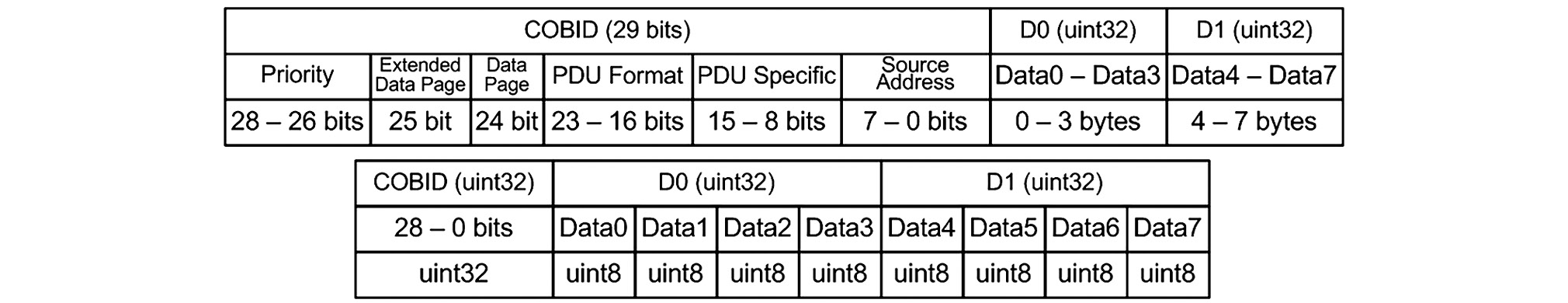 На рис. 3 показан формат сообщений, принимаемых и передаваемых устройствами в сети CAN согласно протоколу J1939. Идентификатор сообщения, обозначенный на рис. 3, как COBID, имеет длину 29 бит, которые разделены на поля. В зависимости от поля PDU Format сообщение может быть широковещательным, то есть направленным группе устройств, либо узковещательным, направленным конкретному адресату. В поле PDU Specific указан адрес устройства, которому направлено сообщение, а в поле Source Address указан адрес устройства, которое отправило это сообщение. В поле Priority указан приоритет сообщения. Остальные поля также используются при адресации сообщений и учитываются при их обработке.