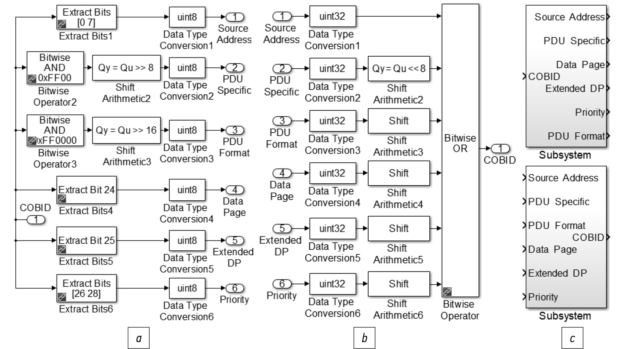 Рис. 4. Модельная схема для выделения полей из идентификатора сообщения (a); модельная схема для формирования идентификатора сообщения (b); модельные подсистемы (c).