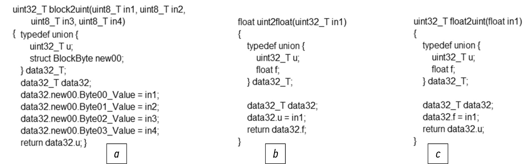Fig. 5. Listings of functions for data packaging and unpacking: a) packaging of four bytes into the block of the uint32 format; b) unpacking the block of the uint32 format to the data of the float format; c) packaging of the data of the float format into the block of the uint32 format.
