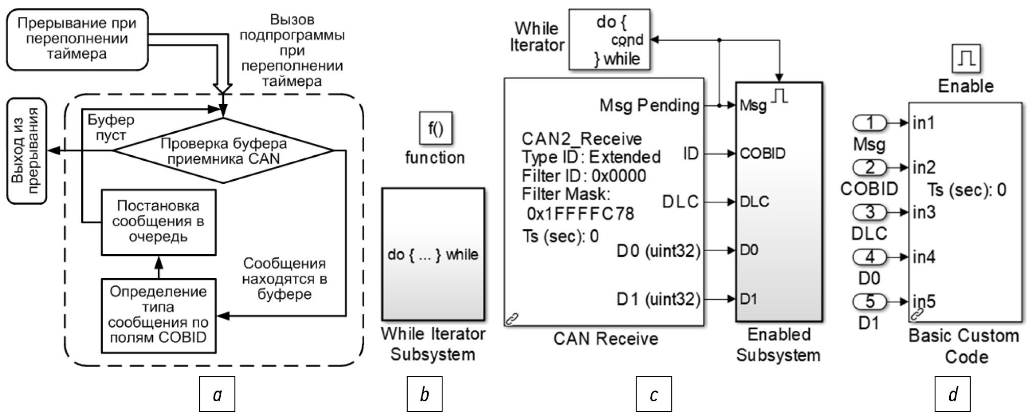 Рис. 6. Циклический доступ к приёмному буферу CAN по прерыванию при переполнении тактирующего таймера: a) блок-схема; b) модельная подсистема цикла do–while; c) модельная схема для цикличного обращения к приёмному буферу CAN; d) обработчик сообщений.