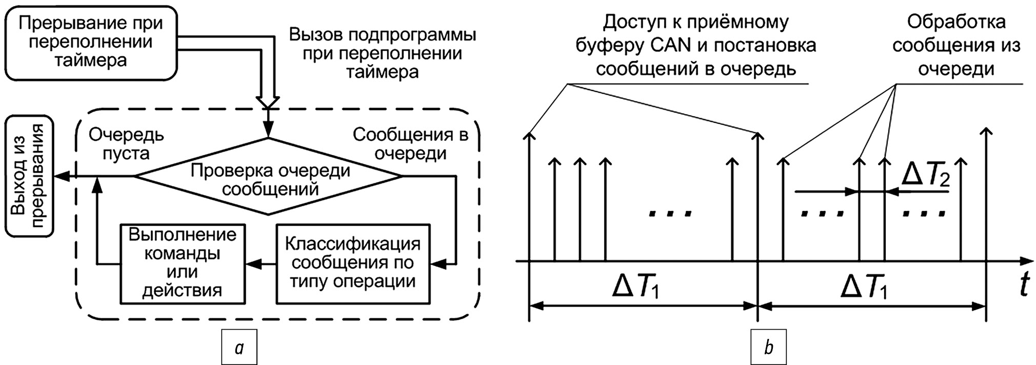 Прерывание при его переполнении должно иметь более низкий приоритет, чем прерывание при переполнении другого таймера, тактирующего обращение к приёмному буферу CAN и формирование очереди, и происходить с таким периодом ΔT2 фиксированной продолжительности, чтобы гарантированно обработать все сообщения из очереди до формирования новой очереди при следующем обращении к приёмному буферу. При ранее указанном периоде доступа к этому буферу ΔT1 = 8 мкс период ΔT2 = 400 мкс, что обеспечивает своевременность обработки до 20 сообщений из очереди и не создаёт вычислительную нагрузку, которая препятствует выполнению других задач микропроцессорного управления электроприводом панорамных стеклоочистителей, рассмотренным в [11].