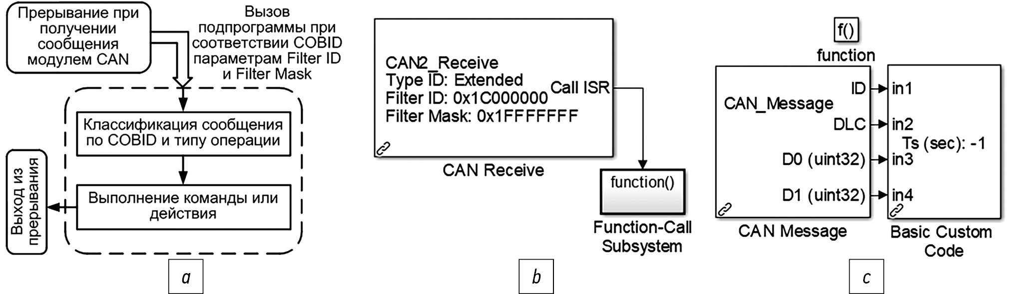 Далее рассмотрим доступ к приёмному буферу CAN по прерыванию, чтобы обработать сообщение сразу же после его приёма, как это иллюстрируется блок-схемой и модельными схемами на рис. 8. Такое прерывание от модуля CAN возникает при получении им сообщения, идентификатор которого соответствует заданным параметрам модельного блока CAN Receive, что будет рассмотрено ниже. Модельная схема, показанная на рис. 8,c, должна быть помещена в подсистему вида Function-Call Subsystem модельного обработчика прерывания, показанного на рис. 8,b.