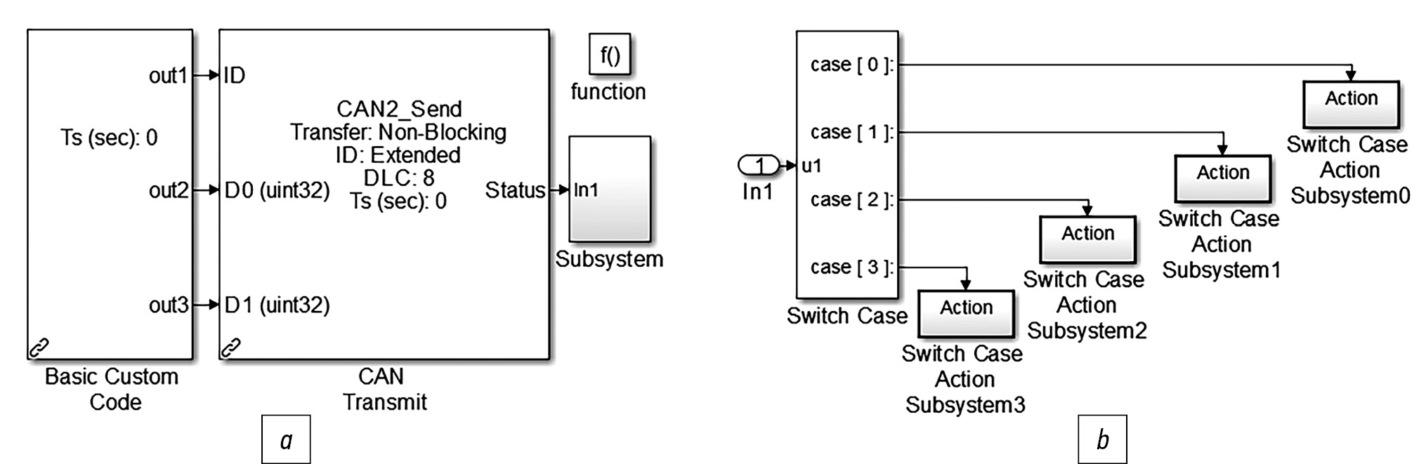 На рис. 9 показаны модельные схемы для отправки ответных сообщений по сети CAN, используемые следующим образом. После выполнения действия, указанного в принятом сообщении, должен быть программно установлен системный флаг, после чего происходит системное прерывание, имеющее назначенный приоритет. Схема его обработчика показана на рис. 2,b. Далее выполняется модельная схема, показанная на рис. 9,a, которая помещена в управляемую подсистему Function-Call Subsystem этого обработчика и осуществляет отправку сообщения по сети CAN, сформированного с помощью модельного блока вида Basic Custom Code. Результат отправки сообщения в зависимости от выхода Status контролируется с помощью модельной схемы, показанной на рис. 9,b, которая основана на модельном элементе оператора выбора Switch Case и помещена в подсистему вида Subsystem, показанную на рис. 9,a. Внутри управляемых подсистем вида Switch Case Action Subsystem, которые вызываются в зависимости от результата отправки сообщения, должны быть помещены модельные схемы и блоки вида Basic Custom Code, чтобы обработать этот результат. Очевидно, что модельная схема, показанная на рис. 9,b, может быть заменена модельным блоком Basic Custom Code с подпрограммой на основе эквивалентных ей синтаксических конструкций языка C элементарного уровня [9].