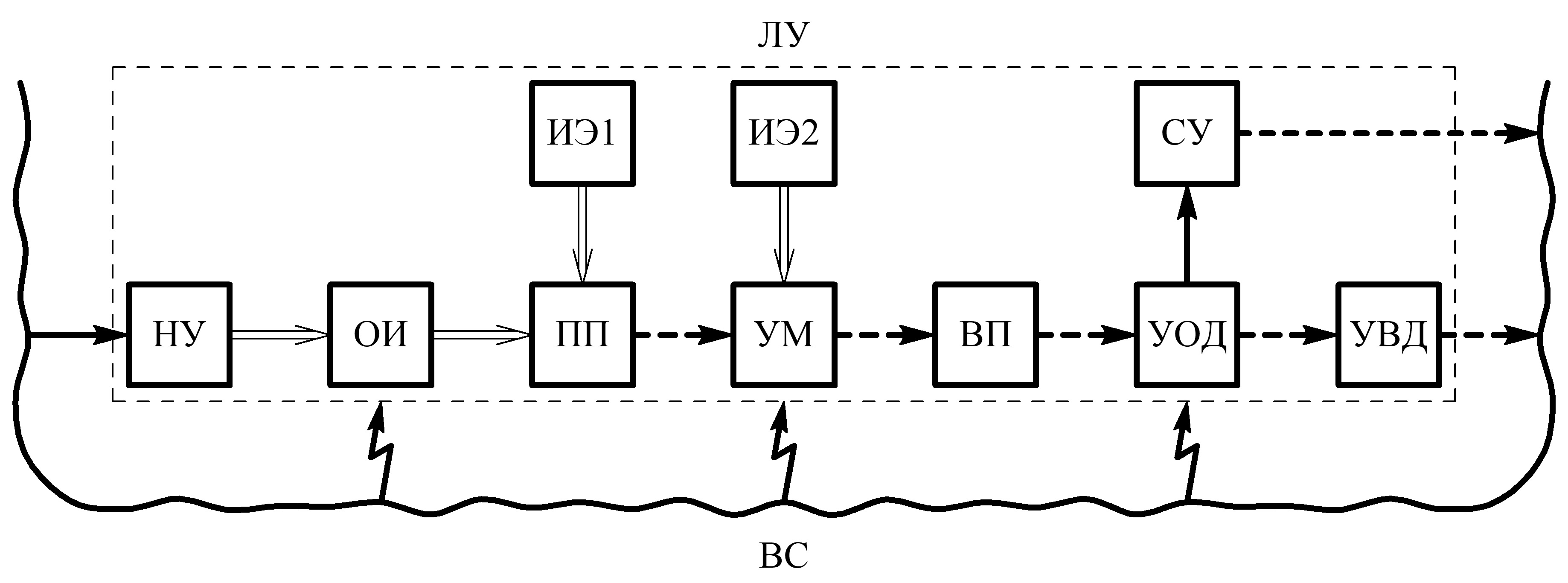 Здесь ЛУ — лабораторная установка в целом, ОИ — объект измерений, НУ —нагружающее устройство, ПП — первичный преобразователь, ИЭ1 и ИЭ2 — источники энергии, УМ — усилитель мощности, ВП — вторичный преобразователь, УОД — устройство обработки данных, СУ — сигнальное устройство, УВД — устройство вывода данных; ВС — внешняя среда, сдвоенные стрелки — силовые и энергетические воздействия, сплошные одинарные стрелки — управляющие воздействия, штриховые стрелки — информационные воздействия, зигзагообразные стрелки — возмущающие воздействия, оказываемые в той или иной мере на все компоненты установки.