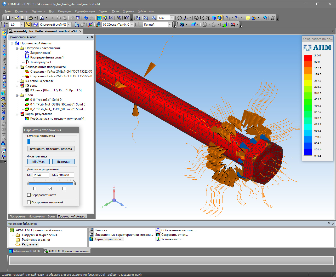 С целью предварительной проверки конструкции на прочность и жёсткость компоненты модели были подвергнуты конечно-элементному анализу средствами входящего в состав «Компас-3D» программного модуля APM FEM [7]. На рис. 3 приведён один из результатов конечно-элементного анализа, относящийся к наименее прочному компоненту установки.