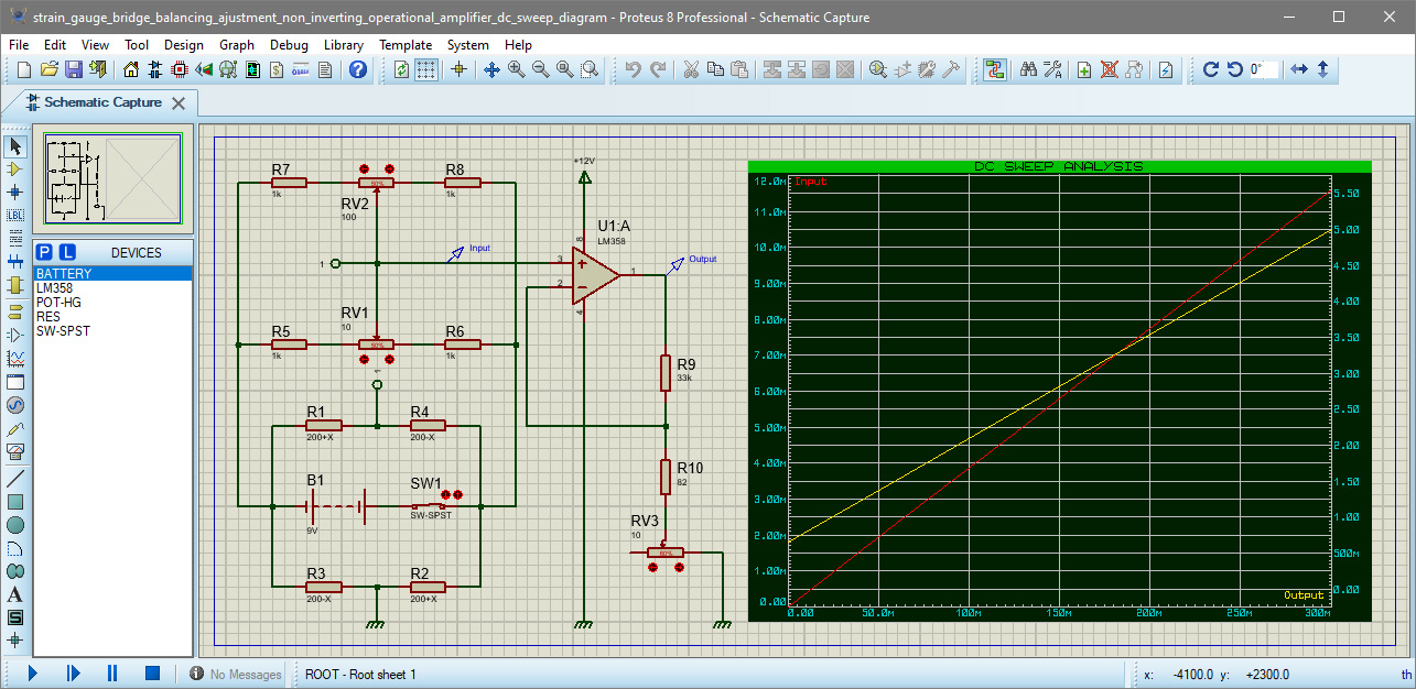 Fig. 4. Virtual model of a strain gauge bridge with balancing and signal amplification in the Proteus Design Suite environment.