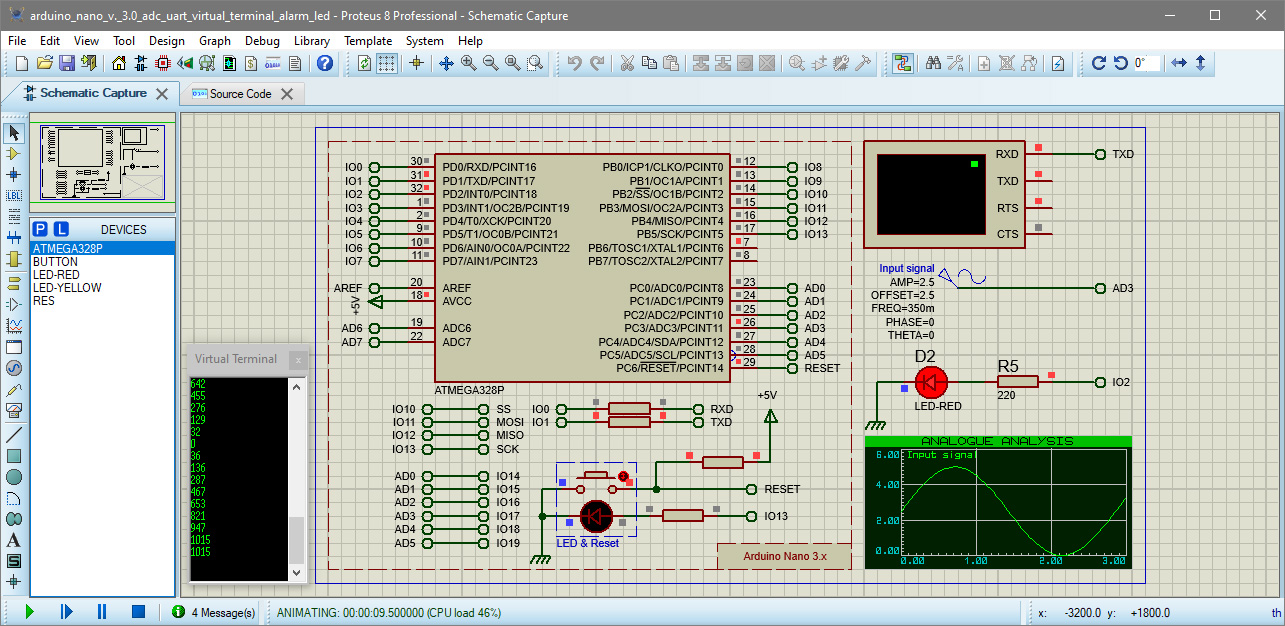Компонентами данной модели являются: блок Arduino Nano 3.x, соответствующий используемой МКП; D2 — сигнальный светодиод; R5 — токопонижающий резистор сигнального светодиода; генератор Input signal, при помощи которого моделируется входной сигнал (см. приведённый на рис. 4 график); виртуальный терминал, в чьём окне при симуляции выводятся передаваемые на ПК результаты аналого-цифрового преобразования.