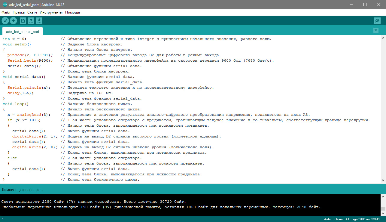 Рис. 6. Текст микропрограммы с пояснениями в среде «Arduino IDE»