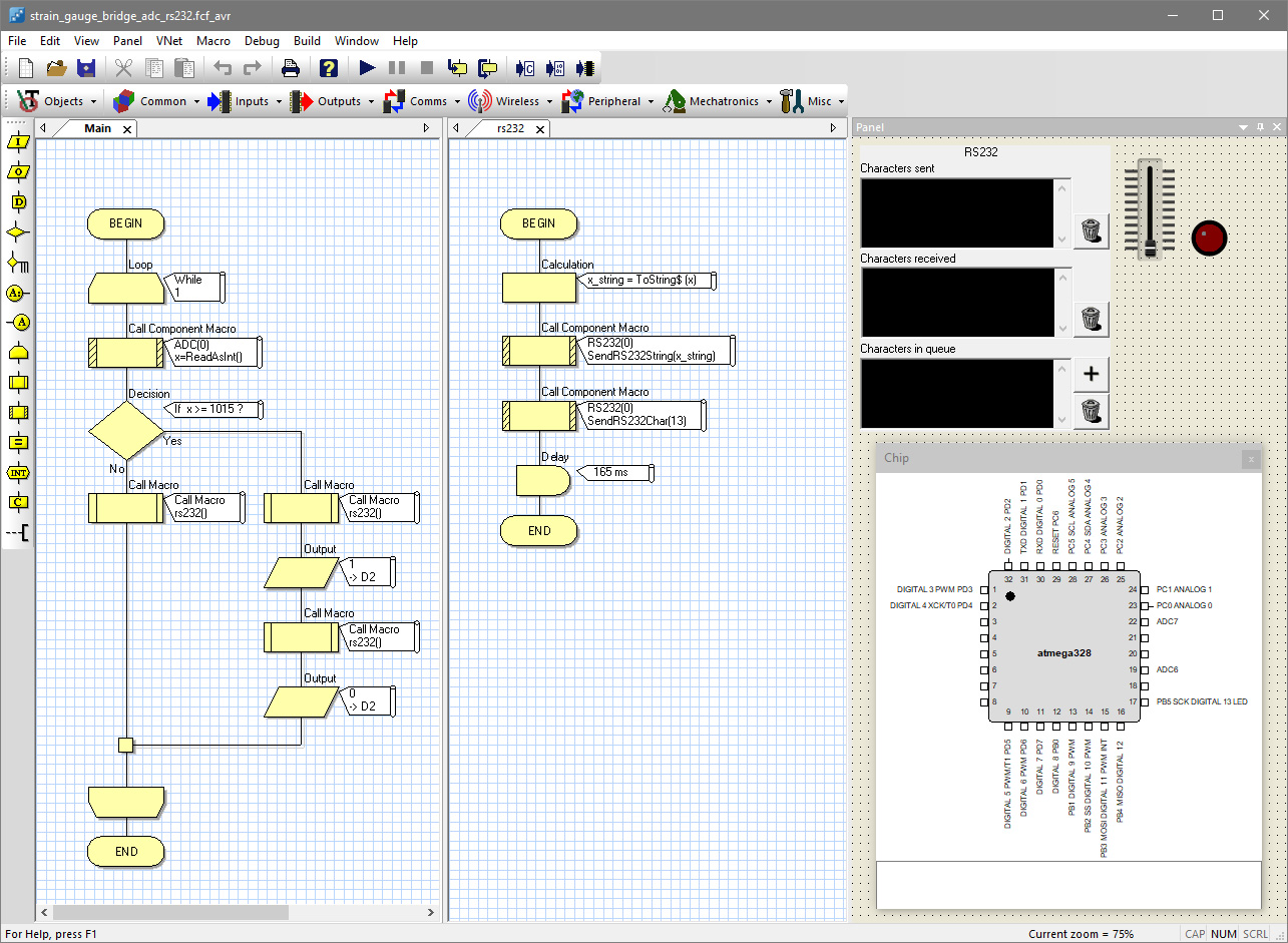 Fig. 7. Firmware algorithmic block diagram, pinout of the target microcontroller and virtual instrument in the Flowcode environment.