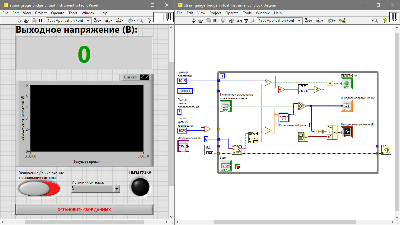 Рис. 8. Окна лицевой панели ВП и его алгоритмической блок-схемы в среде «LabView»