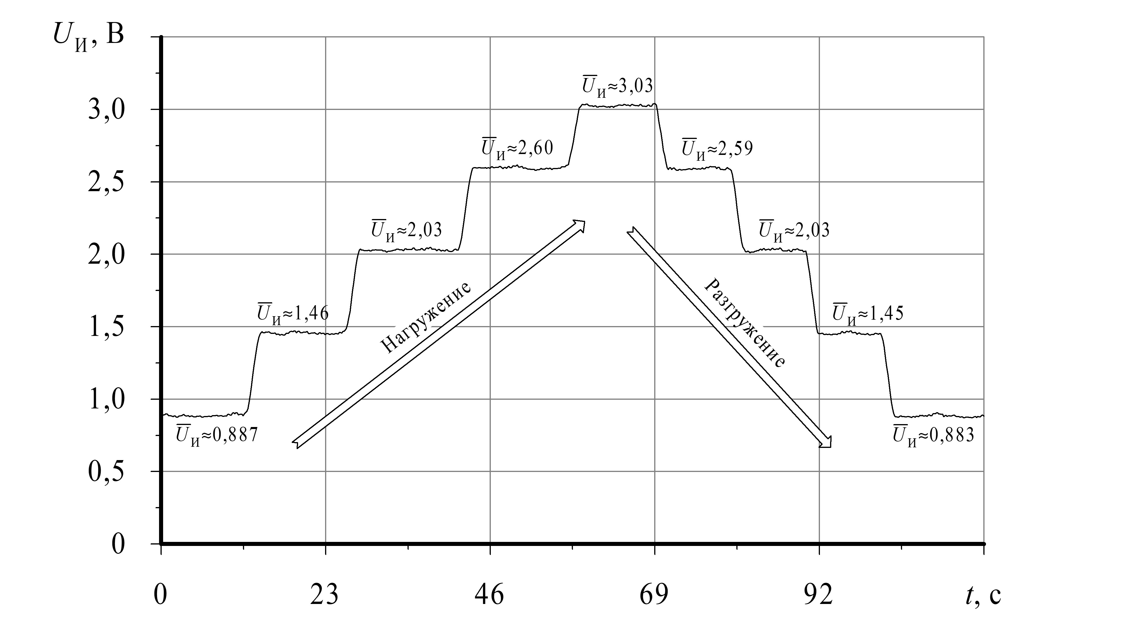 Начальный и конечный участки демонстрируемого графика соответствуют отсутствию грузов на платформе. При этом неравные нолю значения выходного напряжения на них объясняются, во-первых, тем крутящим моментом, который создаётся на полуоси массами рычага и подвеса, а во-вторых — некоторым имманентным смещением ноля на выходе используемого операционного усилителя. Находящиеся между ними участки графика соответствуют последовательному нагружению полуоси массой со значениями 9,7 кг, 19,4 кг, 29,1 кг и 36,5 кг и её разгружению в обратном порядке. По результатам было установлено, что при изменениях массы на идентичные значения абсолютные изменения средних арифметических значений измеренного напряжения в установившихся режимах даже с учётом принципиально неустранимых погрешностей квантования и гистерезиса [13, 19] отличаются друг от друга не более, чем на 0,012 В (около 0,29 % от фактической длины диапазона изменений).