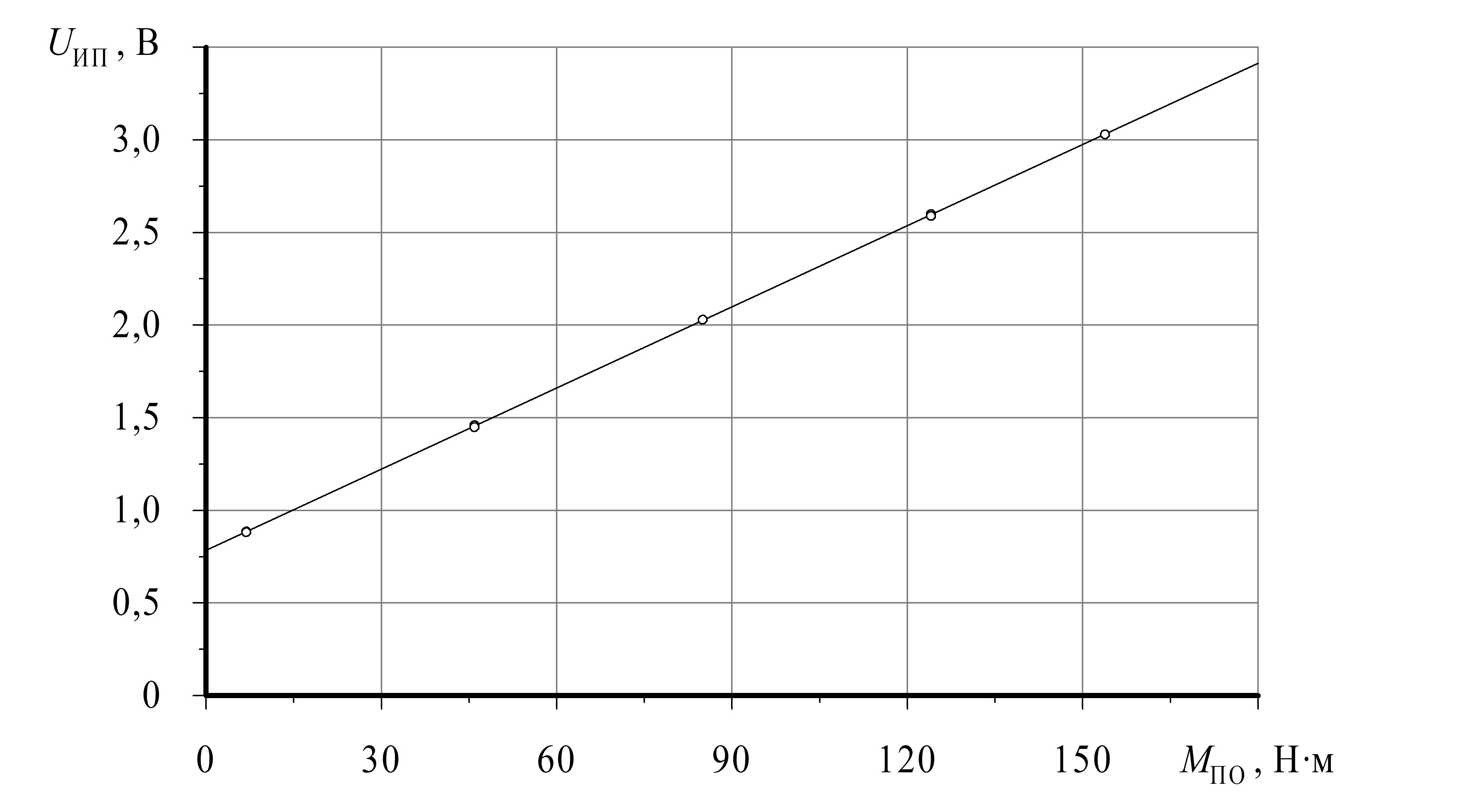 На рис. 10 можно видеть статическую характеристику исследуемого измерительного преобразователя, которая являет собой полученную аппроксимацией по реализованному в среде Mathcad методу наименьших квадратов [2] экспериментальных данных (с учётом масс рычага и подвеса) зависимость напряжения на его выходе от приложенного к полуоси крутящего момента .
