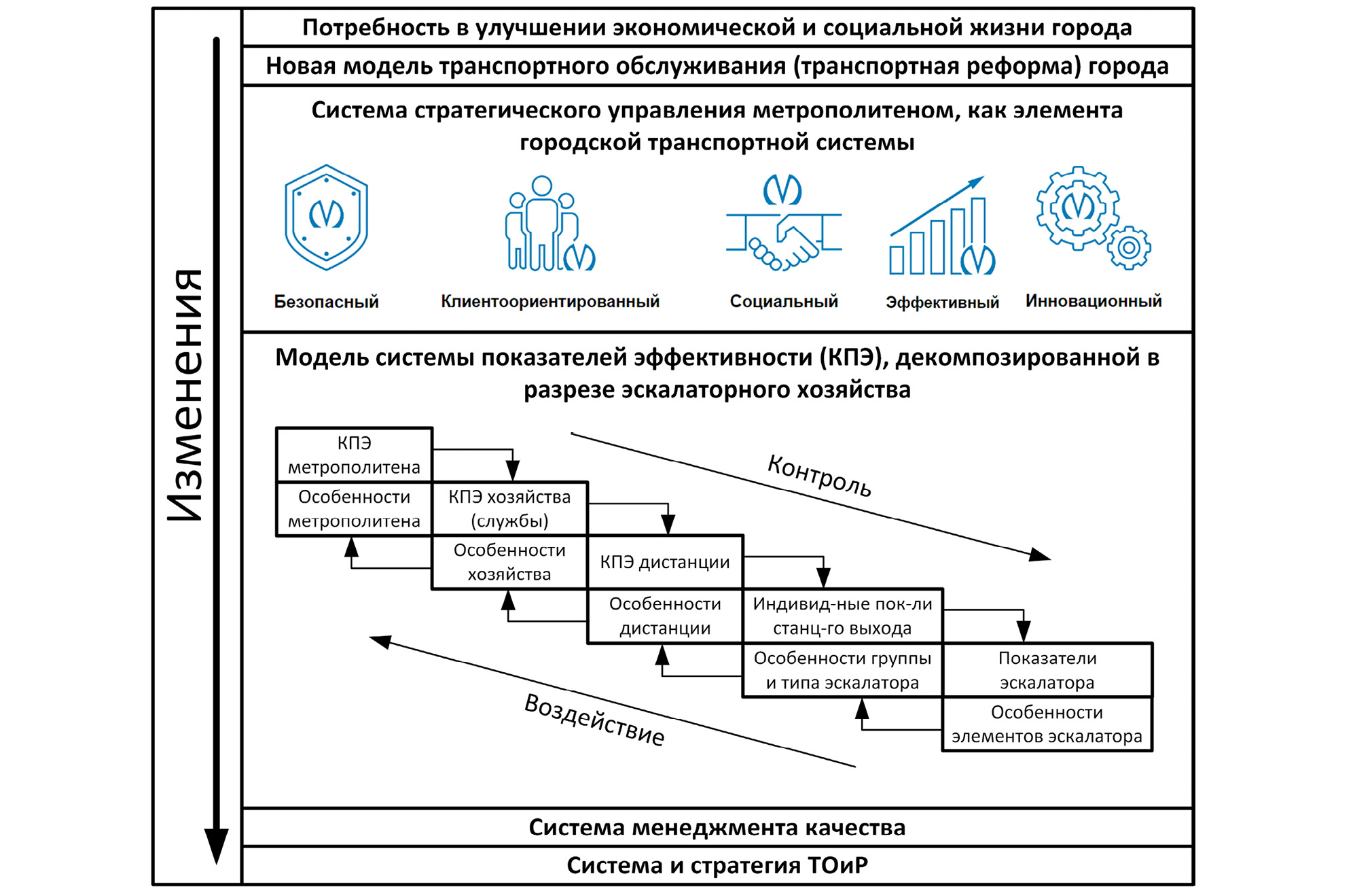 В результате обобщения всего вышесказанного, на рис. 5 показано как изменения, инициированные на первых двух верхних уровнях принятия решения, формируют через третий, четвёртый и пятый на нижнем уровне необходимость адаптации процессов планирования и контроля проведения технических воздействий (из состава существующей системы и стратегий ТОиР) на эскалаторное хозяйство метрополитена, и приведение регламентирующих их нормативно-технических документов в соответствие с современными методами обслуживания, диагностики и мониторинга состояния оборудования.