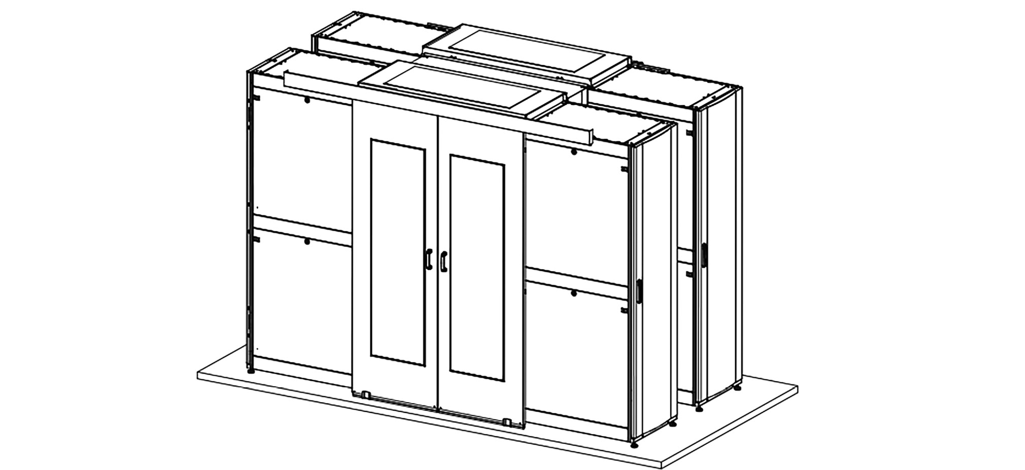 Согласно рекомендациям [26], наиболее важным фактором для организации ЦОД является поддержание оптимального температурно-влажностного режима. По этой причине основным конструктивным элементом внестанционного устройства является система изоляции коридоров, представленная на рис. 6, в состав которой, входят унифицированные шкафы-стойки с передними и задними дверьми для организации зон доступа к оборудованию для обслуживания и ремонта, потолочные панели, система раздвижных дверей и боковые панели, а также внутрирядные прецизионные кондиционеры.