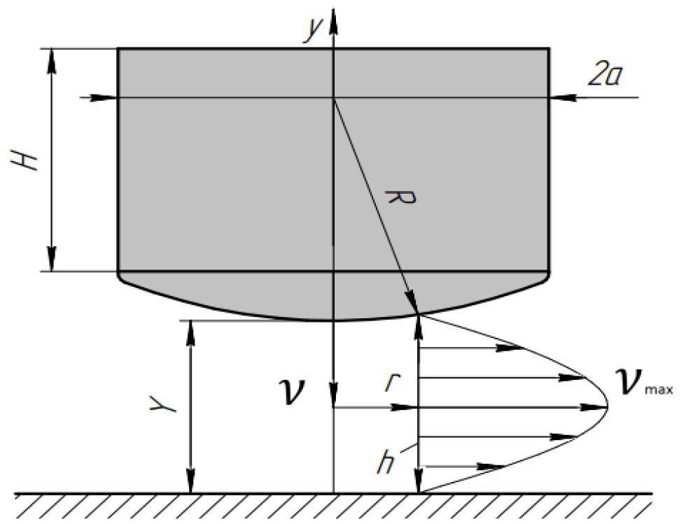 The gap width between the bottom surface of the particle and the flat wall decreases with time. Thus, the particle is assumed to be cylindrical with a flat top surface and a spherical bottom surface. Moreover, the flow regime in the annular section between the downward-moving particle and the flat wall is assumed to be laminar. The distribution of velocity over the gap thickness is assumed to be parabolic, and for a given , the average velocity in height is , and the velocity gradient at the surface is equal to or .