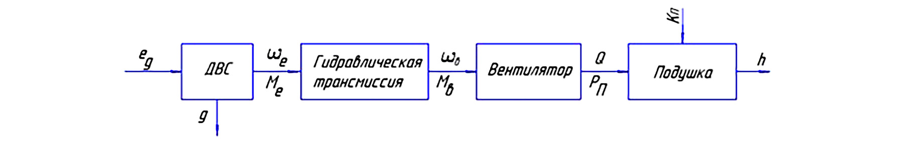 Целью настоящего исследования является разработка математической модели подъёмной системы СВП, состоящей из ДВС, гидрообъёмной трансмиссии и вентилятора, подающего воздух в секции воздушной подушки (рис. 1).