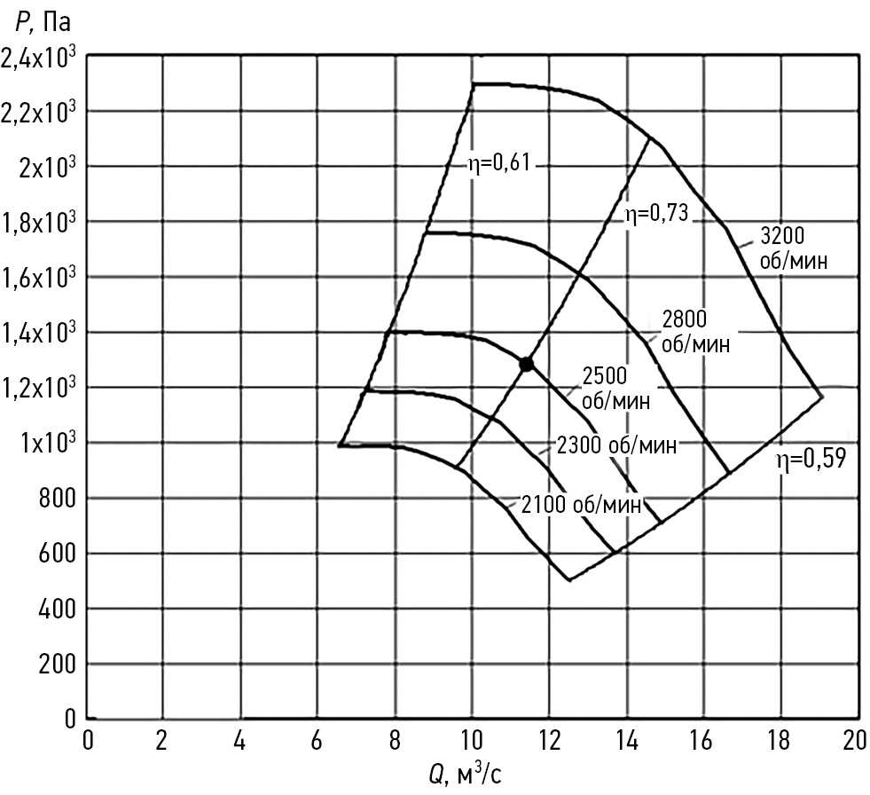 Характеристика выбранного для проведения исследования вентилятора ОВ-109 в рассматриваемой области, построенная с помощью его экспериментально подтверждённой безразмерной характеристики [4], приведена на рис. 2.