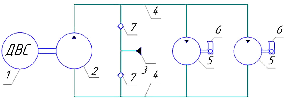 Fig. 3. Principal scheme of the hydrostatic transmission of the hovercraft lift system: 1 — the ZMZ-51432.10 CRS engine; 2 — the Danfoss non-adjustable axial piston pump; 3 — flow from a feeding pump; 4 — a hydraulic line; 5 — the Danfoss non-adjustable axial-piston hydraulic motor; 6 — an axial fan; 7 — a feeding valve.