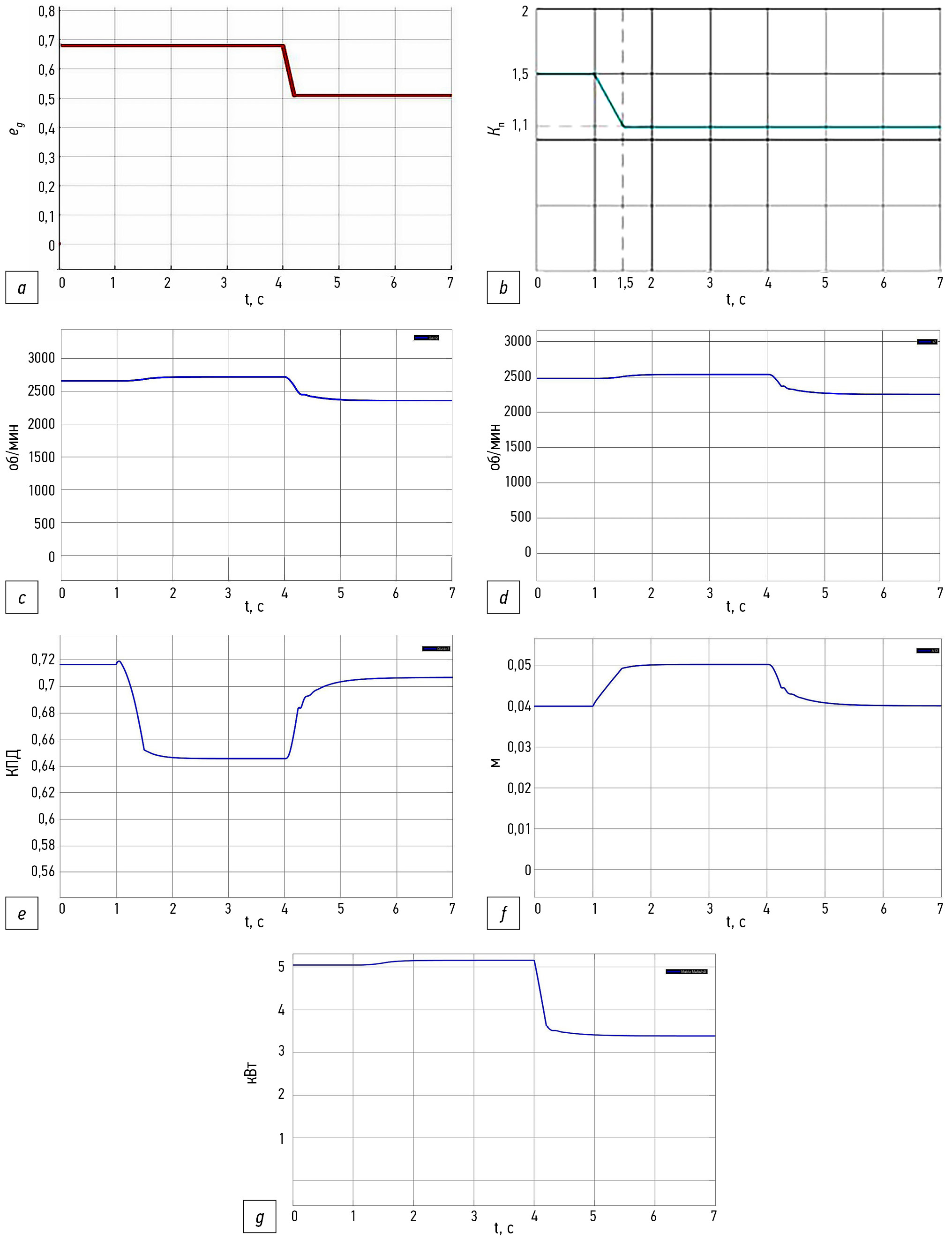 Во втором случае при изменении свойств опорной поверхности при движении судна увеличивается полный напор вентилятора из-за увеличения от 1,5 до 1,7. Полученные при моделировании результаты отражены в переходных процессах, представленных на рис. 5.