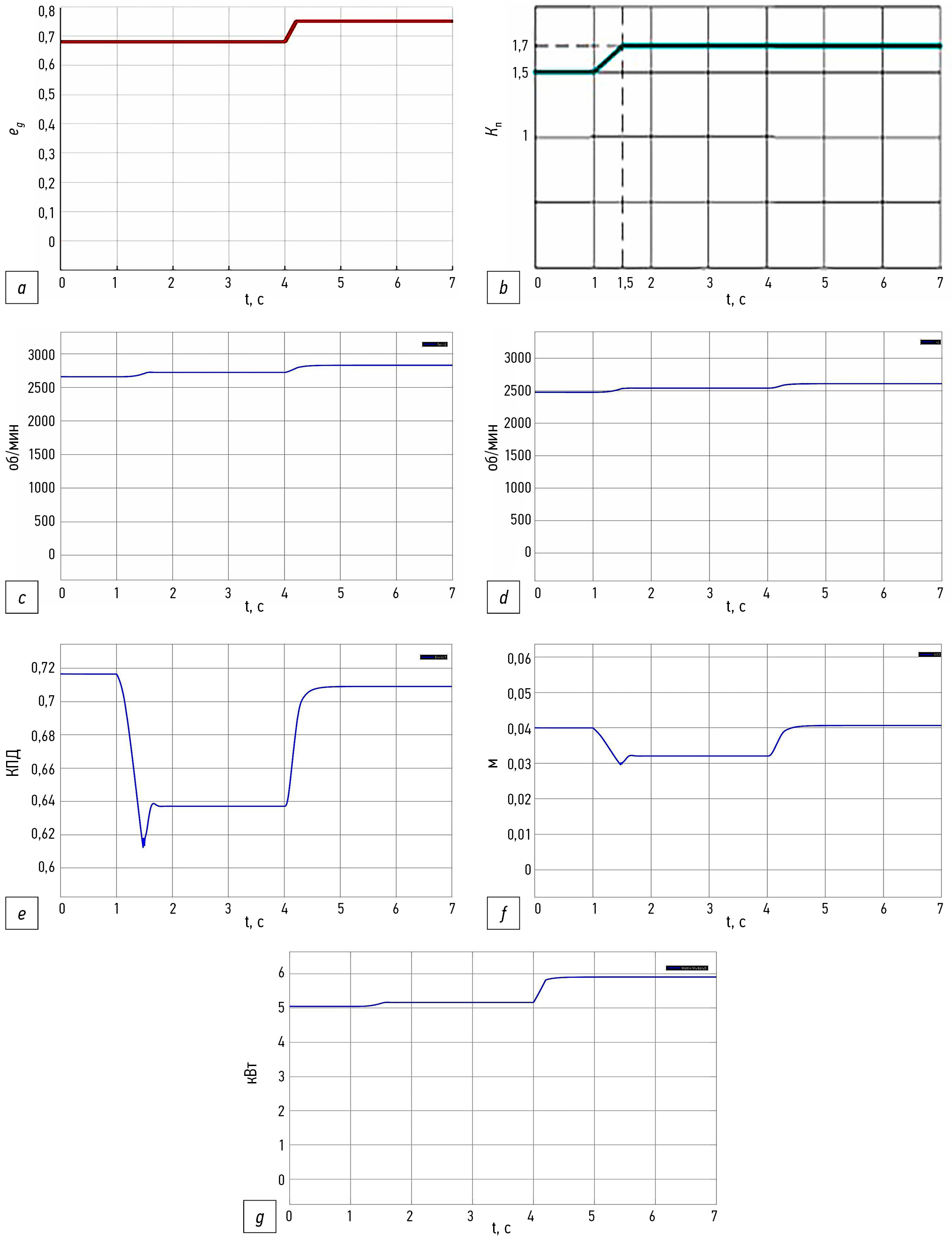 Рис. 5. Переходные процессы при увеличении : a — параметр регулирования двигателя ; b — сигнал ; c — частота вращения двигателя ; d — частота вращения вентилятора ; e — КПД вентилятора ηв; f — высота СВП над опорной поверхностью h; g — мощность двигателя Ng .