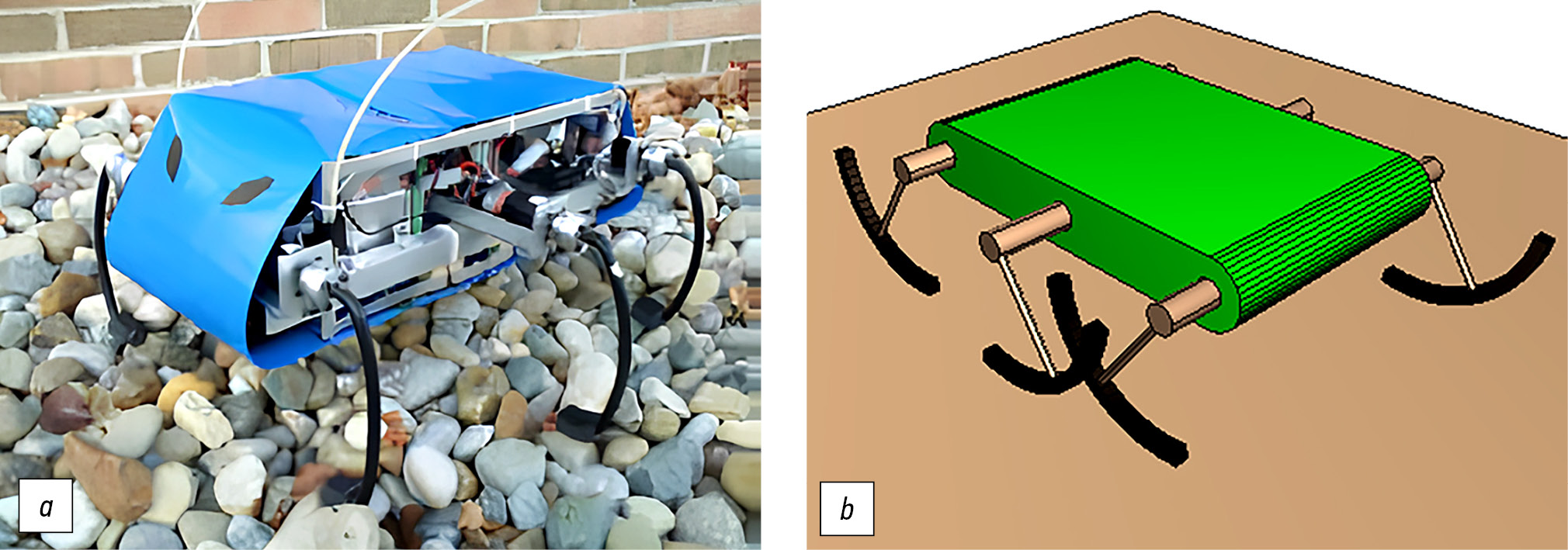 Рис. 1. Внешний вид роботов: a — робот RHex; b — внешний вид модели прототипа исследуемого робота.