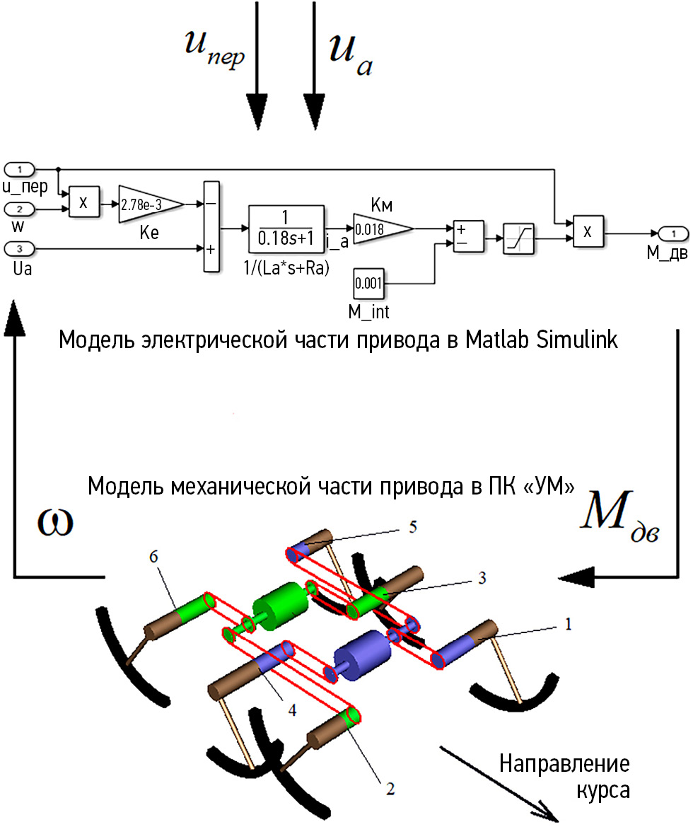 Модель ДПТ и редуктора, который имеет передаточное число , создана в среде моделирования Matlab Simulink, и подключена к модели механической части в программном комплексе динамики твёрдых тел средствами ПК «Универсальный механизм».