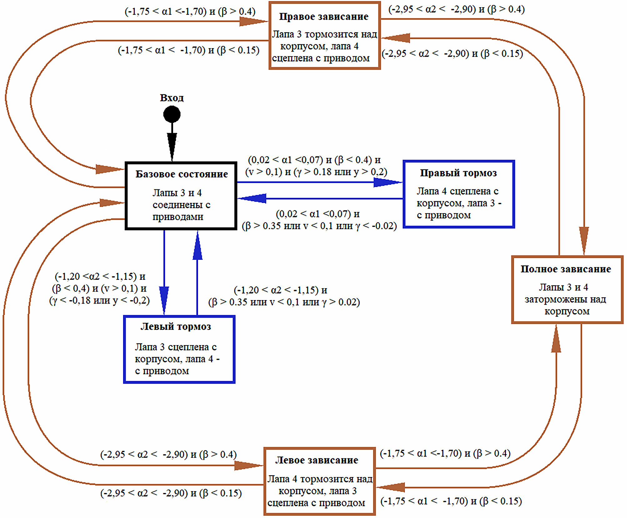 На рис. 4 и 5 представлена структурная схема управления движением робота во всех описанных ниже режимах. Прямоугольниками обозначены различные состояния, а стрелками — условия перехода между ними. Переменные, которыми определяются условия перехода, и моменты начала отсчёта этих переменных показаны на рис. 3, где α1 — угол поворота первой группы «лап» («лап» 1, 4, 5); α2 — угол поворота второй группы «лап» («лап» 2, 3, 6); β — угол тангажа робота; γ — угол рысканья робота; y — расстояние до вектора требуемого курса на опорной плоскости; Ua1, Ua2 — напряжения на якоре первого и второго ДПТ, соответственно.