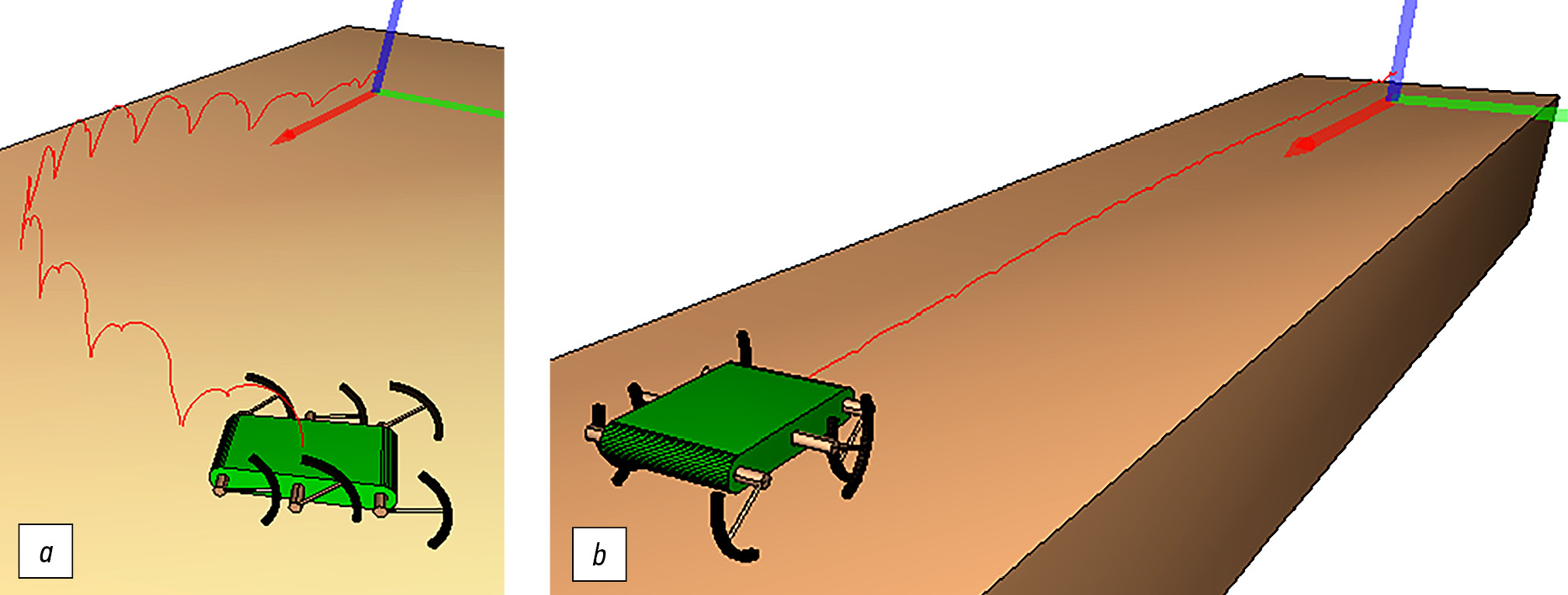 Рис. 6. Траектории движения робота: а — при отсутствии управления контроллерами; b — под управлением контроллеров устойчивости и курса.