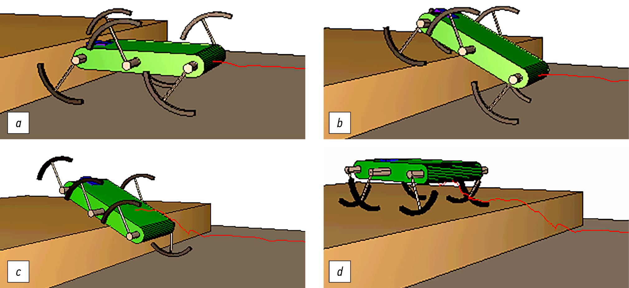 Fig. 11. Climbing the 1,2h step: а — the robot puts the № 2 “leg” on the step; b — the № 3 and № 4 “legs” are stopped not to interfere approach to the step; c — the robot puts the № 5 “leg” on the step, the climbing ends with push of rear “legs” away from the step’s edge; d — the robot finishes the climbing.