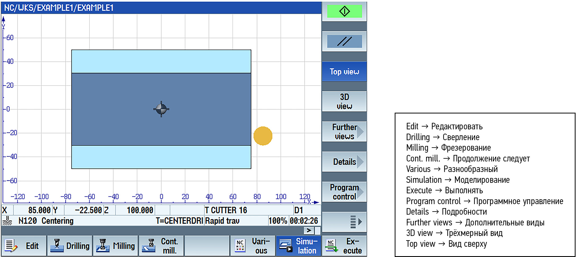 На рис. 1 приведён пример визуализации обработки заготовки, представленный в среде разработки Sinumerik 840D. Как мы видим, визуальная составляющая представляет собой несколько частей: