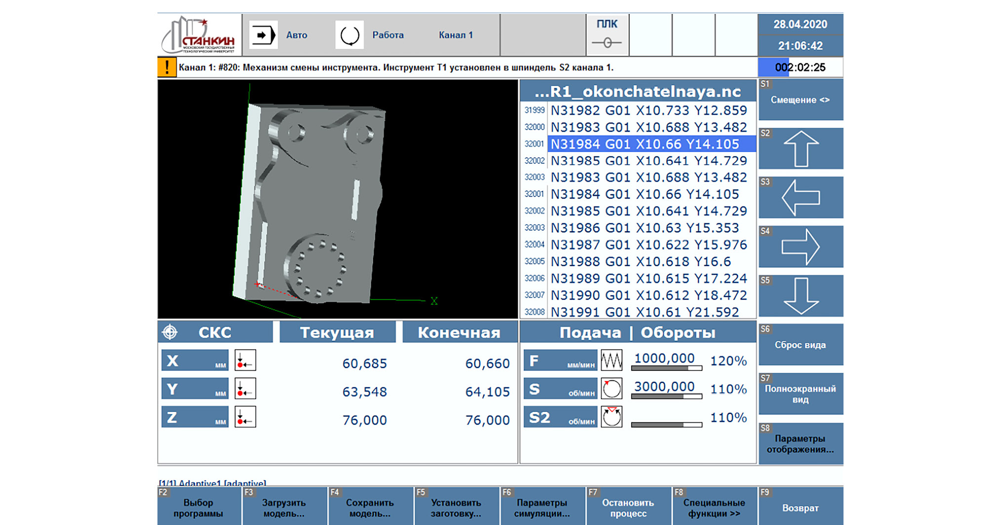 Имеется возможность отслеживать текущие и конечные координаты, параметры подачи, скорость вращения шпинделя.