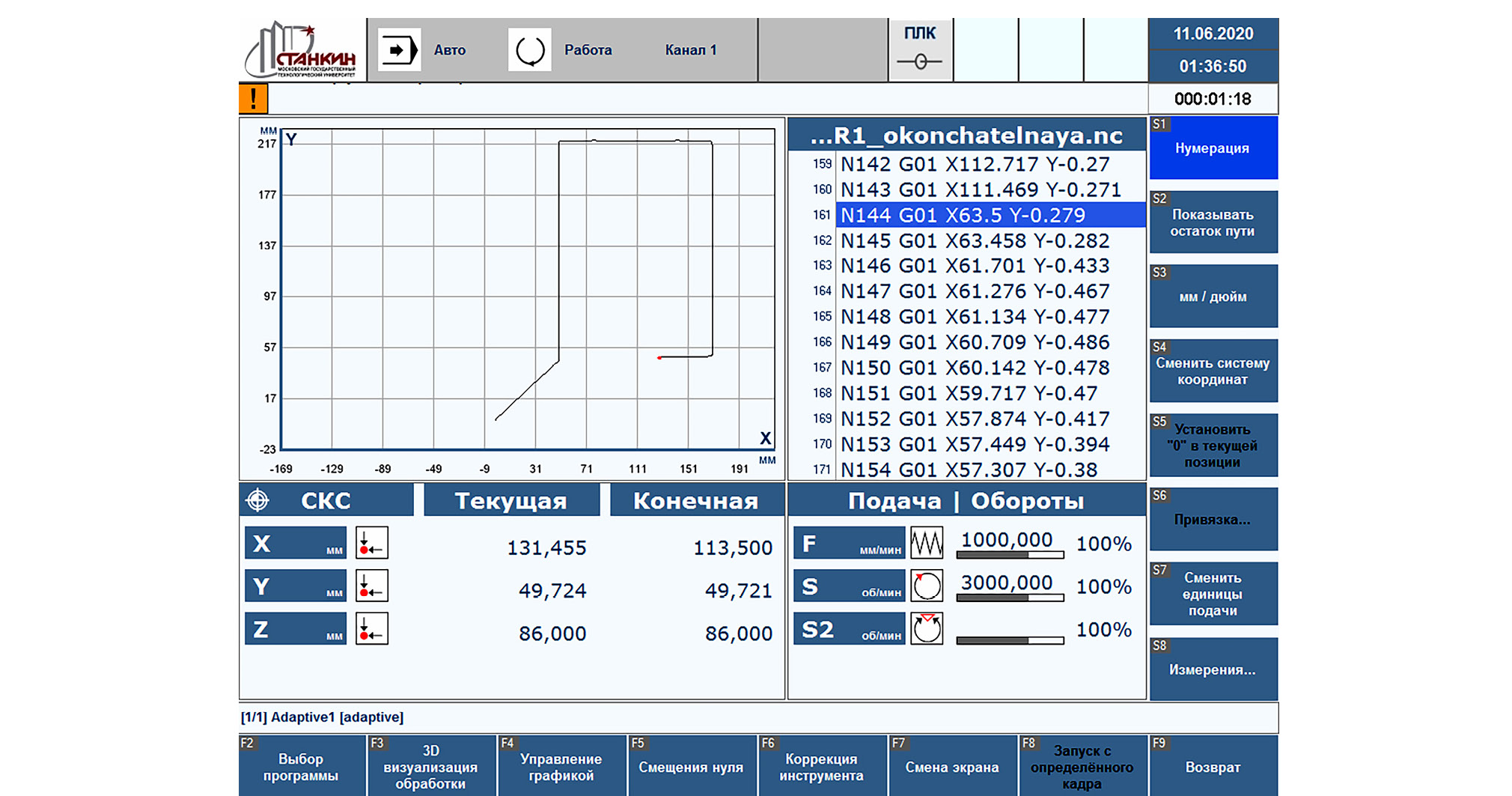 Важно отметить, что есть возможность в данной системе ЧПУ видеть реальные параметры процесса обработки, т. е. реальные положения координат, реальные скорости обработки и вращения инструмента, но отсутствует возможность анализировать данные реальные параметры наглядно [7].
