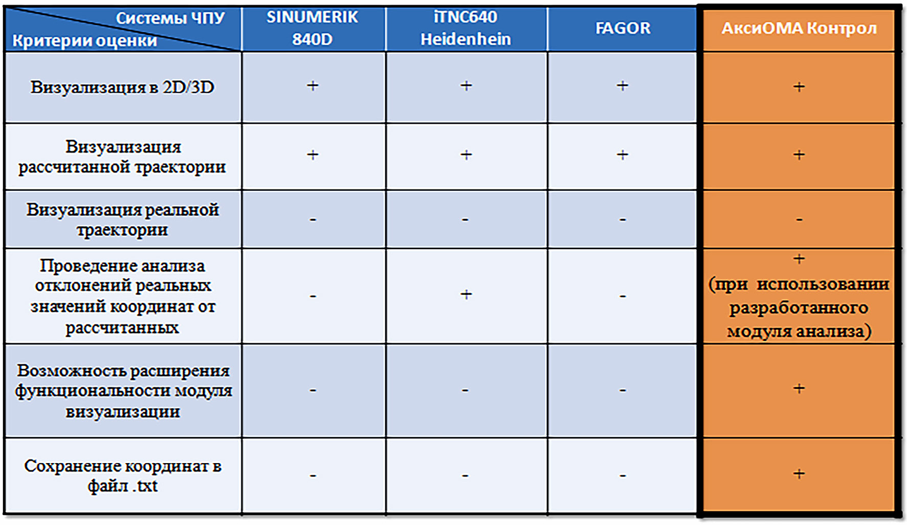 Во всех системах ЧПУ есть реализация визуализации рассчитанной траектории, а также везде присутствует 2D- и 3D-визуализация. Из табл. 1 видно, что отсутствует визуализация реальной траектории у всех систем ЧПУ. Проведение анализа отклонений реальных значений координат от рассчитанных присутствует в системе ЧПУ Heidenhein, а также в ЧПУ «АксиОМА Контрол» при условии, что будет использоваться разрабатываемый модуль анализа траектории. Возможность расширения функциональности модуля визуализации доступна только в ЧПУ «АксиОМА Контрол», в других системах отсутствует, так как «АксиОМА Контрол» является открытой и гибкой системой, а другие имеют закрытый код. Также в табл. 1 можно увидеть отсутствие графы «Сохранение координат в файл .txt», которая присуща другим системам ЧПУ, кроме «АксиОМА Контрол», что позволяет провести полноценный анализ с рассчитанными и реальными координатами.