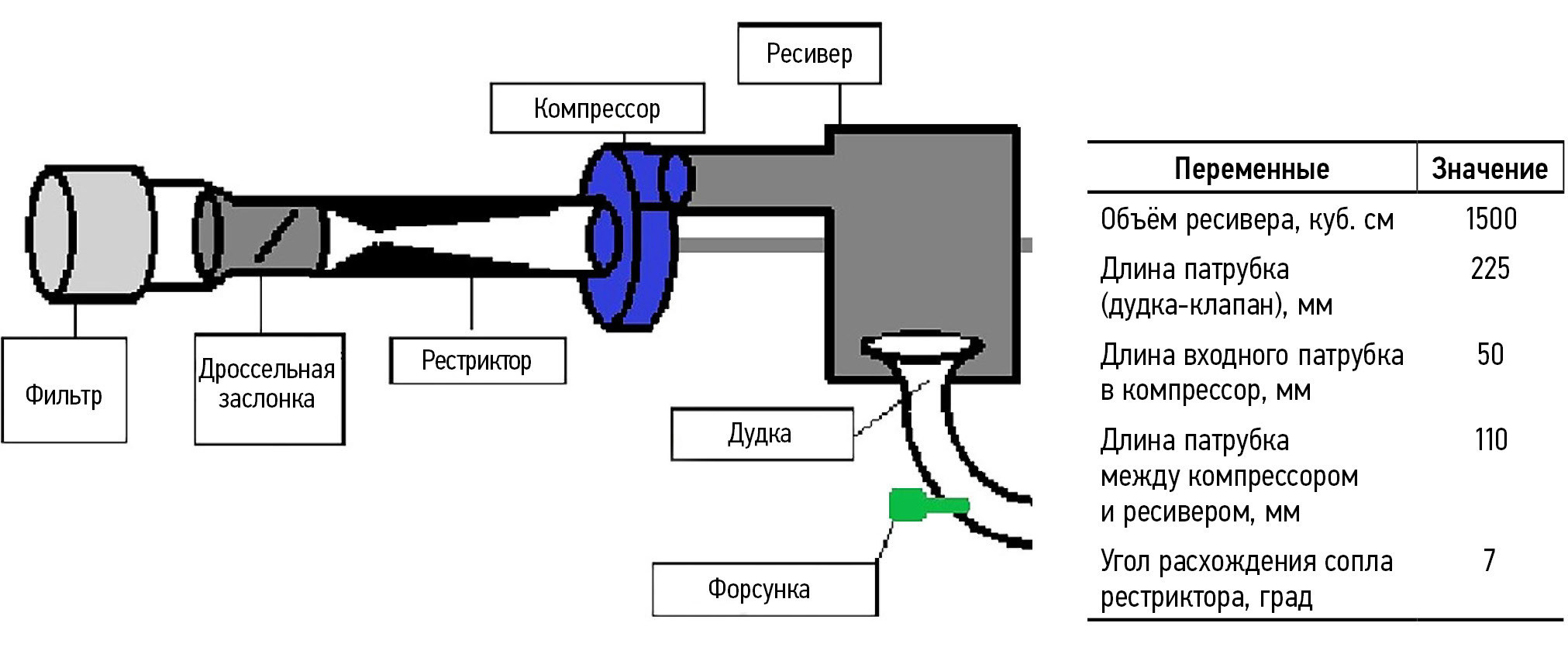 Решения этих проблем описаны в проекте “Разработка системы турбонаддува Формулы САИ” Cal Poly [1]. Впускная система двигателя команды «Формула Студент» включает в себя воздушный фильтр, дроссельную заслонку, рестриктор, компрессор, ресивер и впускной патрубок (“дудка”) (рис. 1).
