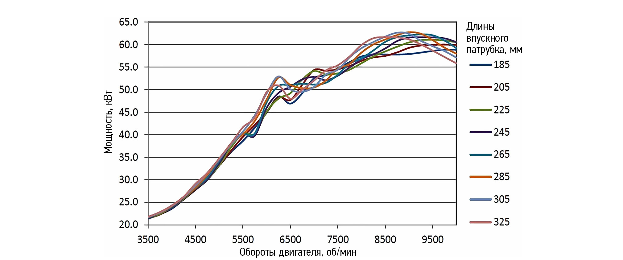 Из полученных данных (рис. 3) видно, что длина в 225 мм даёт одну из наиболее пологих кривых крутящего момента, что позволяет более эффективно использовать двигатель на автомобиле.