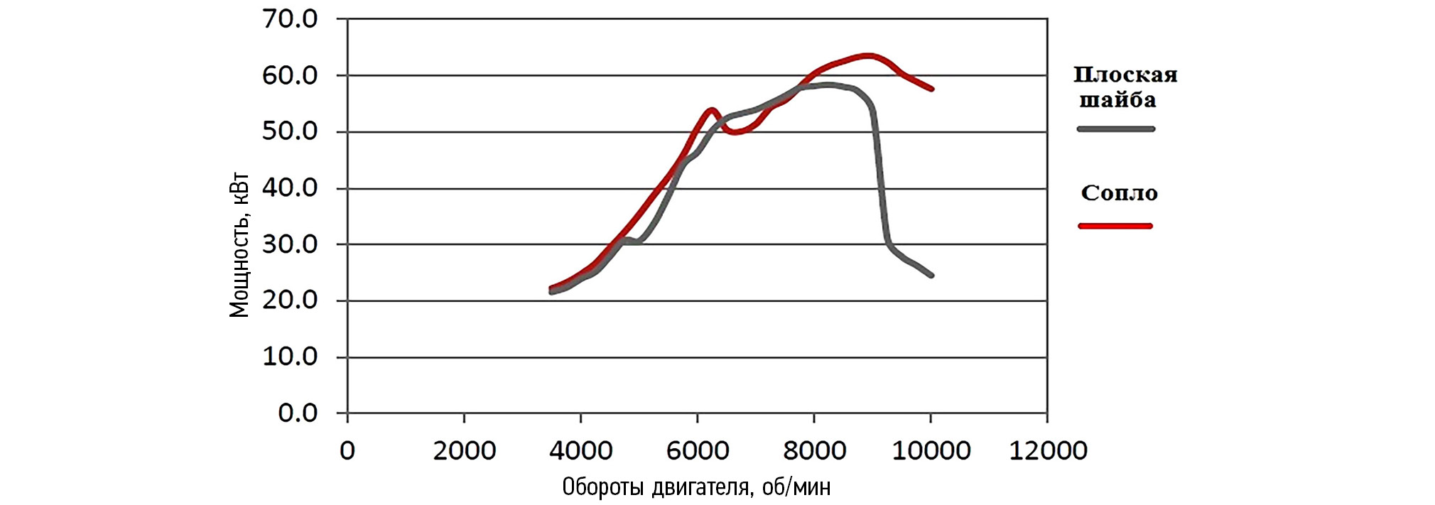 Правильно рассчитанная форма патрубка с рестриктором даёт существенное повышение выходной мощности и крутящего момента двигателя. В конечном итоге лучшей формой было выбрано суживающе-расширяющийся патрубок. В совокупности правильно рассчитанная форма дала 15% прибавления к мощности по сравнению с простой конструкцией в виде шайбы. На рис. 4 приведён график зависимости мощности от конструкции патрубка с рестриктором. Серая линия — конструкция в виде простой плоской шайбы, красная линия — расходящееся сопло.