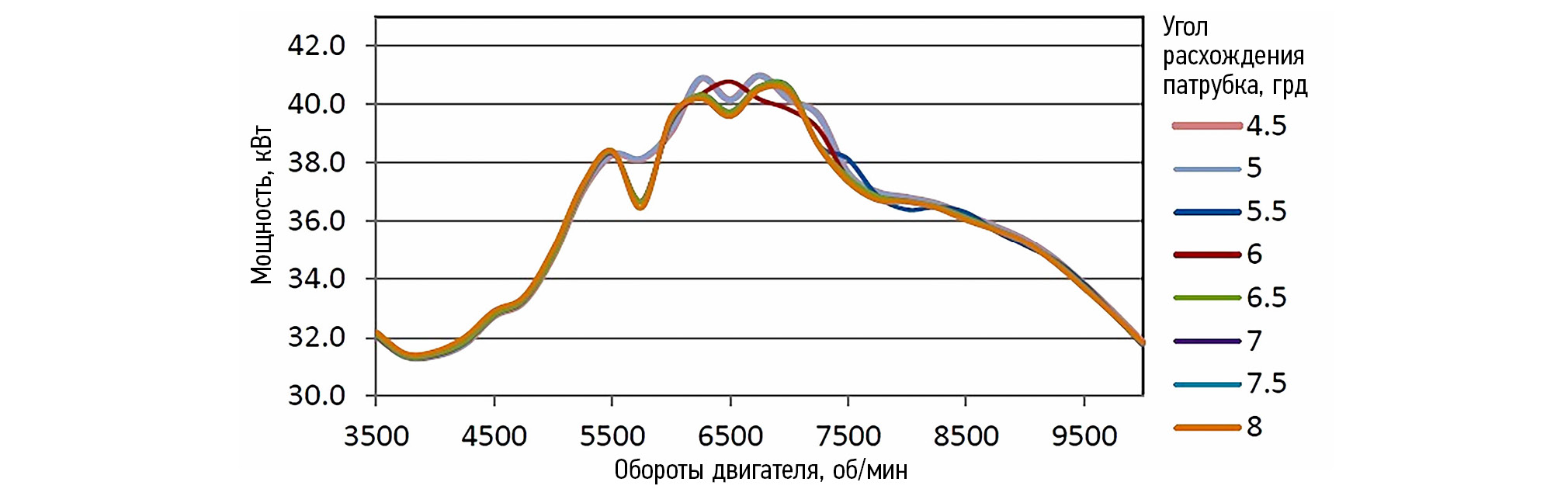 Рис. 5. Влияние угла расхождения патрубка с рестриктором на мощность двигателя.
