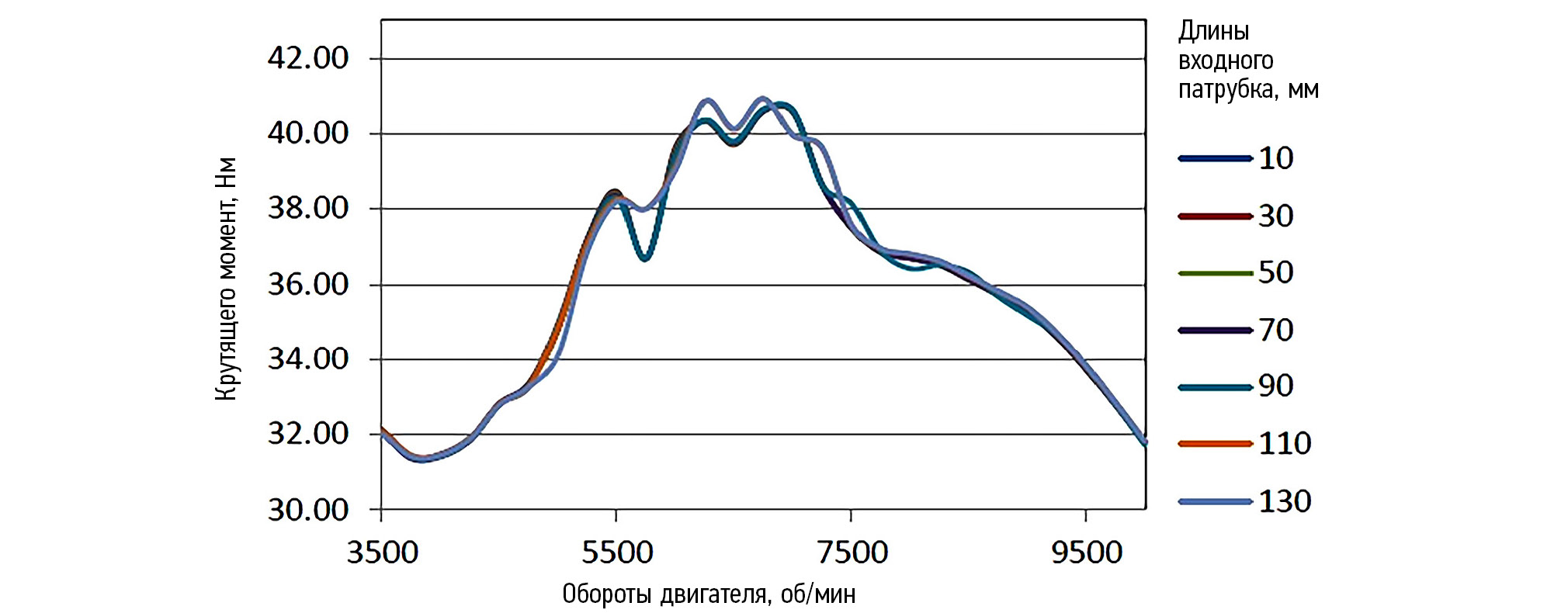 Рис. 6. Влияние длины входного патрубка на крутящий момент двигателя.