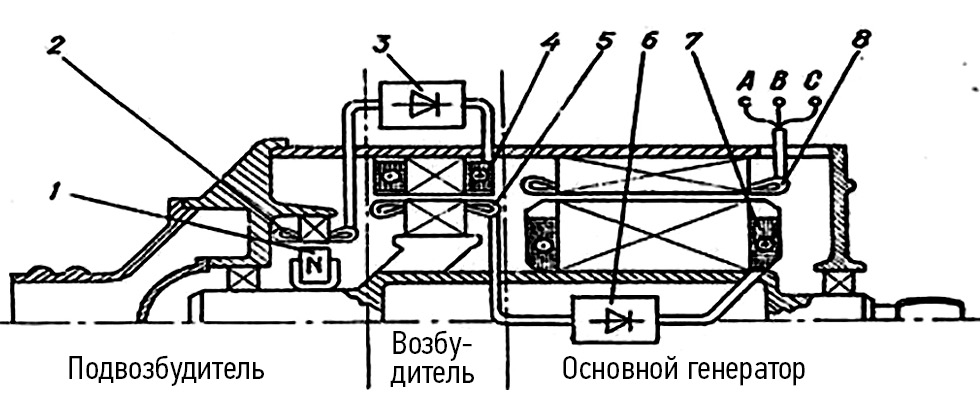 The generator features an exciter designed as a synchronous machine. The armature winding of the exciter, along with a rectifier and a regulating device, is securely attached to the machine body. The winding of the exciter rotor supplies power to the generator’s excitation winding through a rotating rectifier, located between the claw pole tips.