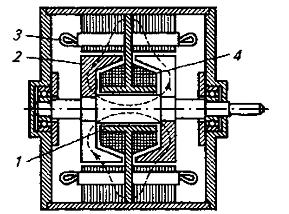 Fig. 4. Magnetic system of the Marshall Fred A 14/30 alternator: 1 — a bushing of an excitation winding; 2 — a pole tip; 3 — a stator winding; 4 — the excitation winding.