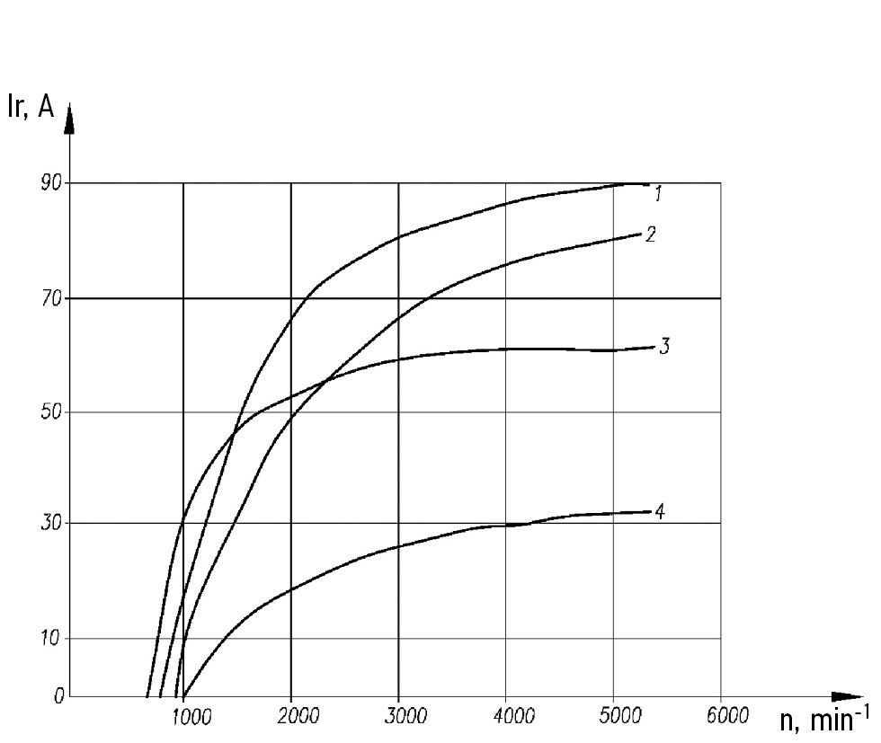 Fig. 6. Current-speed curves of alternators: 1 — the Motorola 8SB2001-R; 2 — the Delco Remy 30 Si 400; 3 — the Bosch T4; 4 — the Marshall Fred A-14/30.
