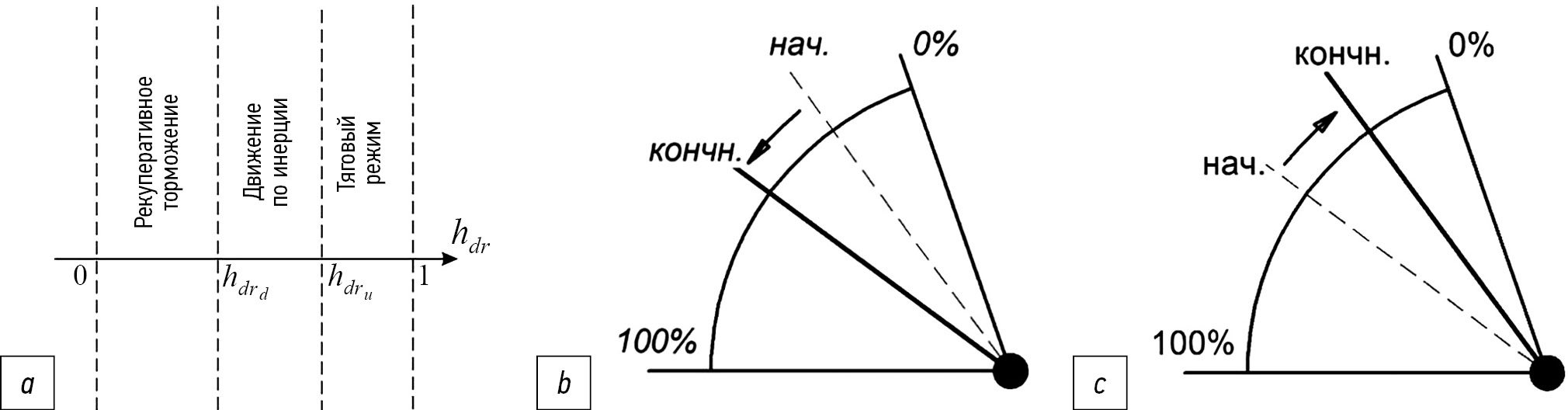 Fig. 1. Main control principles [18, 19]: a — vehicle motion modes depending on an accelerator pedal position; b — at pushing the pedal; c — at releasing the pedal.