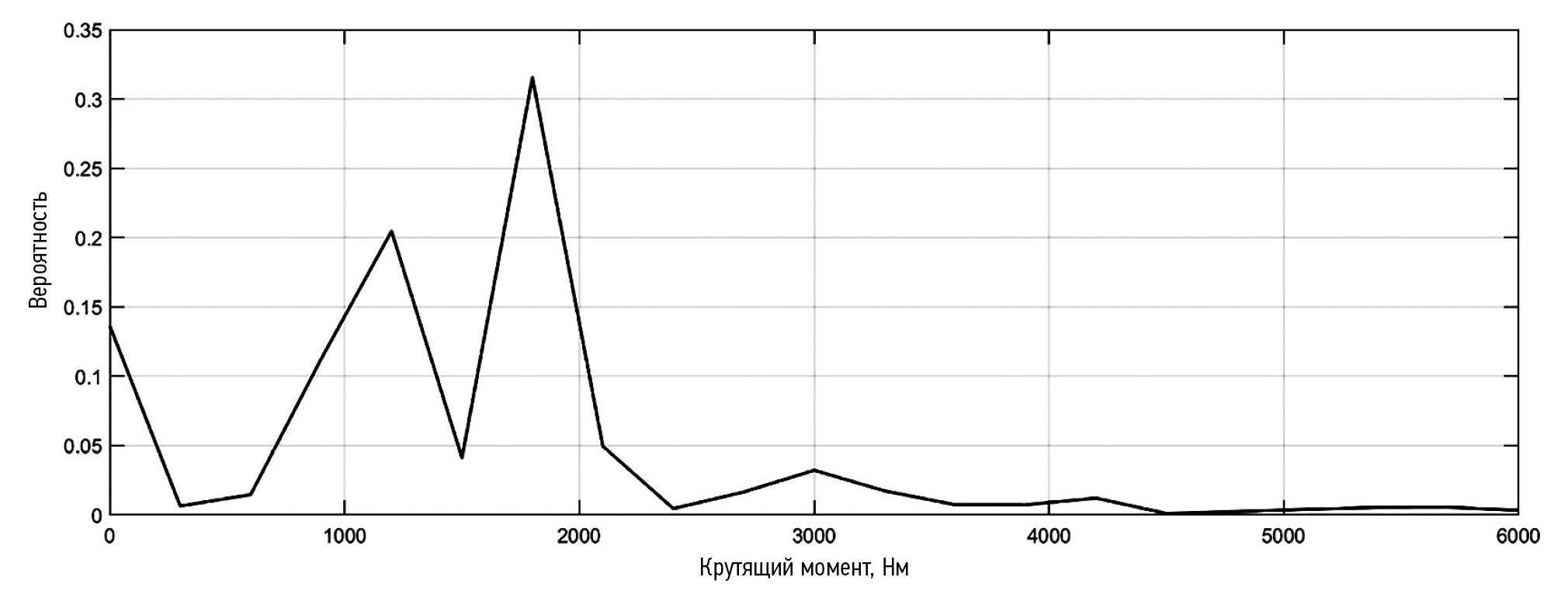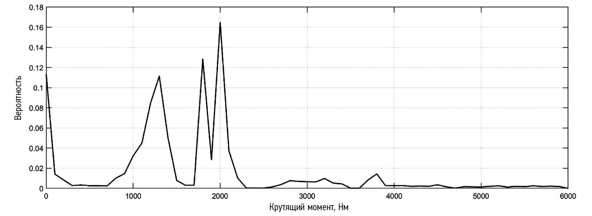 Рис. 5. Плотность вероятности крутящего момента на ведущем колесе для варианта с прямым управлением (двухпедальное управление).