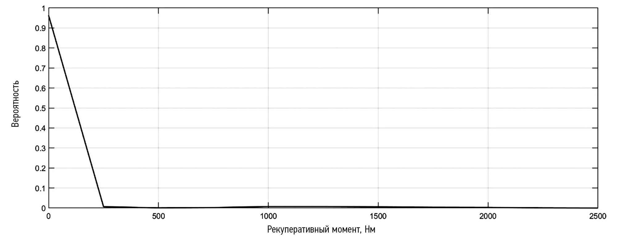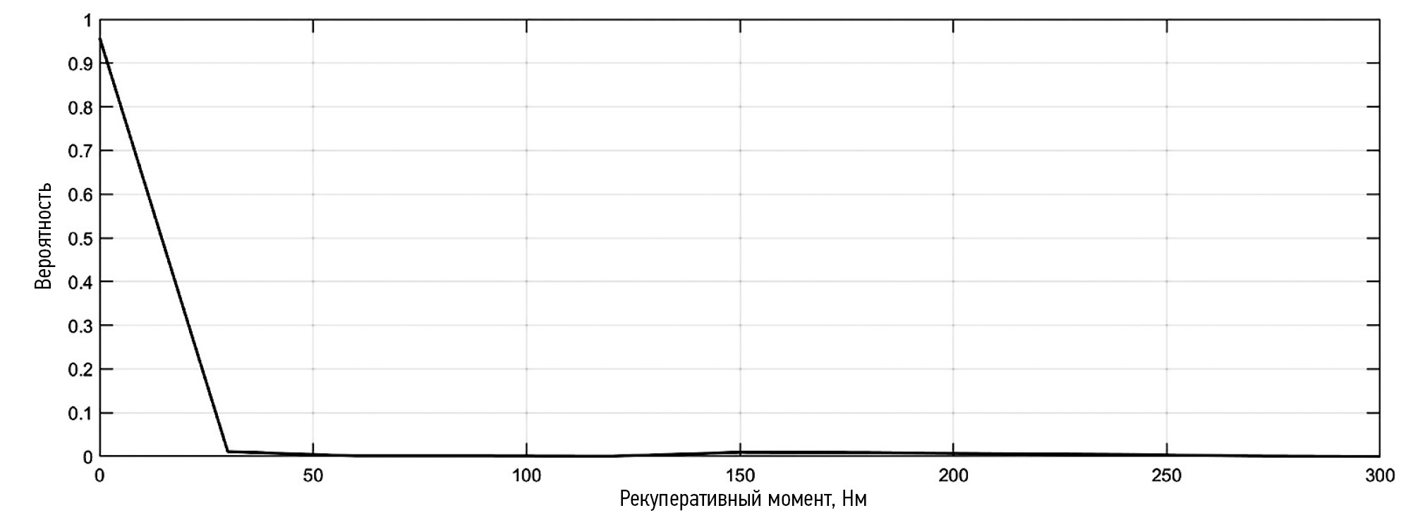 Рис. 6. Плотность вероятности рекуперативного момента на ведущем колесе для варианта с прямым управлением моментом (двухпедальное управление).
