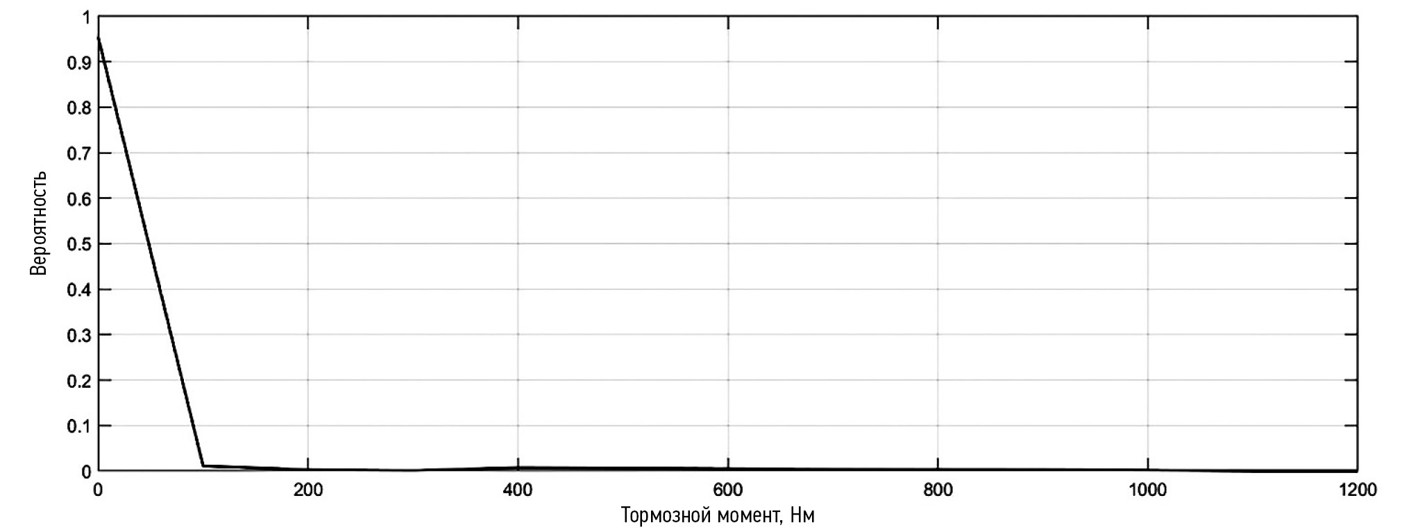 Рис. 7. Плотность вероятности тормозного момента на ведущем колесе для варианта с прямым управлением моментом (двухпедальное управление).