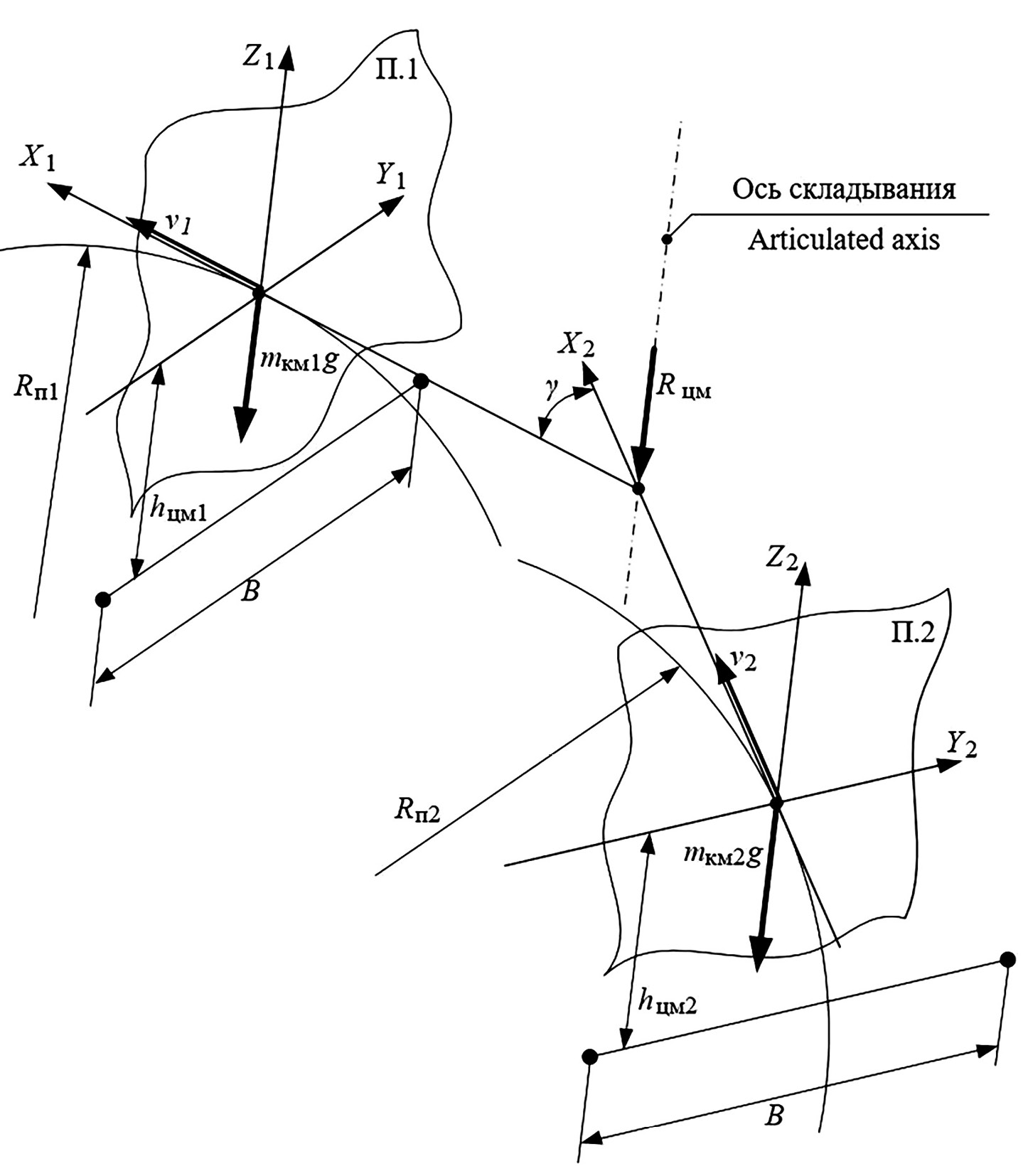 где mкм1 — масса передней секции, кг; mкм2 — масса задней секции, кг; g — ускорение свободного падения, м/с²; v1 — скорость передней секции, м/с; v2 — скорость задней секции, м/с; Rсц — вертикальная сила в сцепном устройстве, Н; В — колея колёс, м; Rп1 — кинематический радиус поворота передней секции, м; Rп2 — кинематический радиус поворота задней секции [5, 6], м; hцм1 — высота центра масс передней секции [7], м; hцм2 — высота центра масс задней секции, м; γ — измеренный угол складывания, рад.